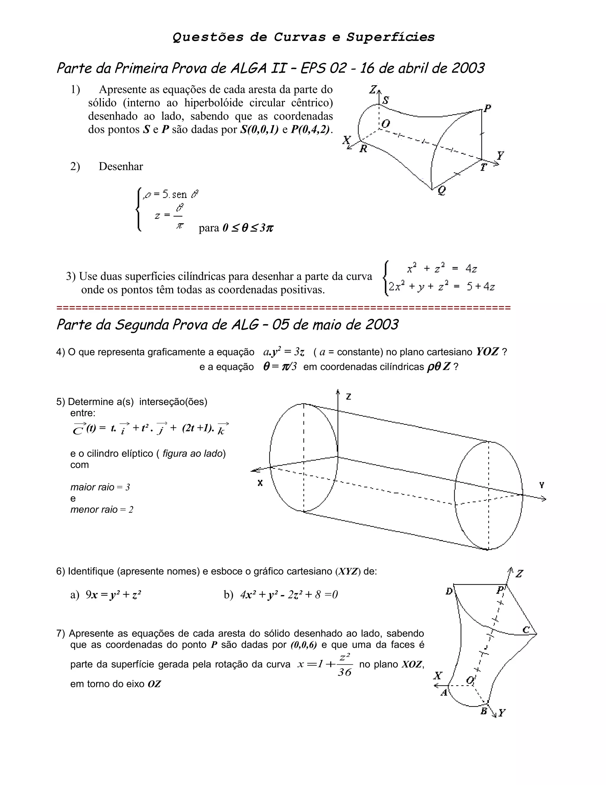O documento contém 28 exercícios sobre curvas e superfícies em coordenadas cartesianas e cilíndricas. Os exercícios incluem identificar equações de curvas e superfícies, esboçar gráficos, e encontrar interseções entre curvas e superfícies. Muitos exercícios envolvem sólidos definidos por combinações de curvas e superfícies.