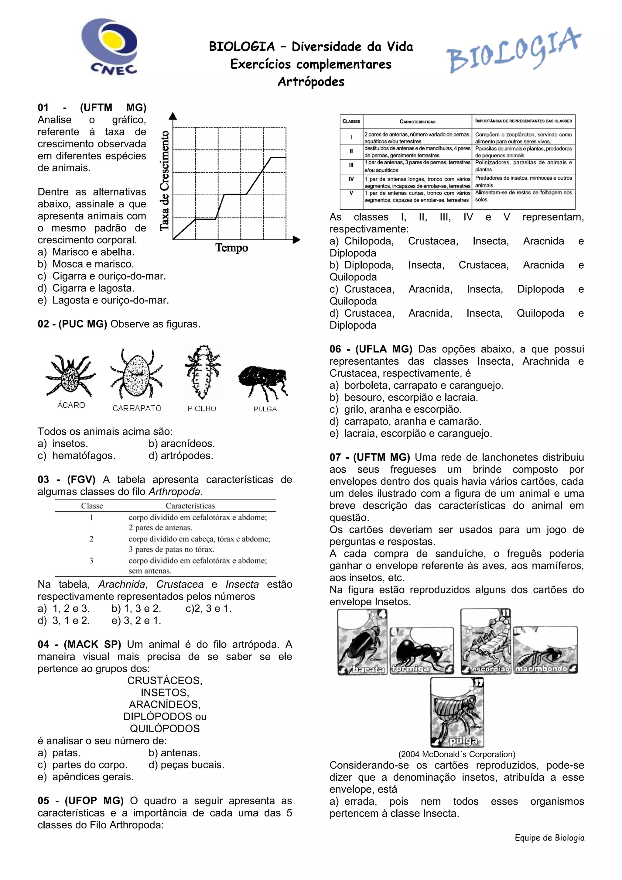 O documento contém 20 questões sobre biologia e diversidade da vida, especificamente sobre o filo Arthropoda. As questões abordam tópicos como classes de artrópodes, características morfológicas, ciclo de vida de insetos, relações evolutivas e doenças transmitidas por artrópodes. O gabarito fornecido apresenta as alternativas corretas para cada uma das 20 questões.