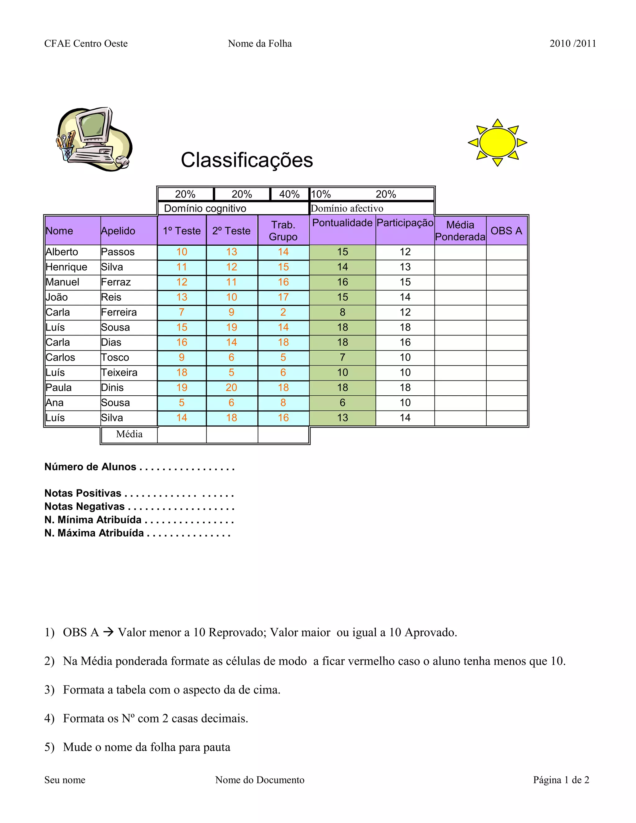 Este documento apresenta uma tabela com os resultados de vários alunos em diferentes testes e trabalhos de grupo. A tabela inclui nomes, notas, médias ponderadas e outras informações sobre o desempenho dos alunos. Há também instruções para formatar e proteger a tabela, realizar pesquisas sobre os dados e criar um gráfico comparativo.
