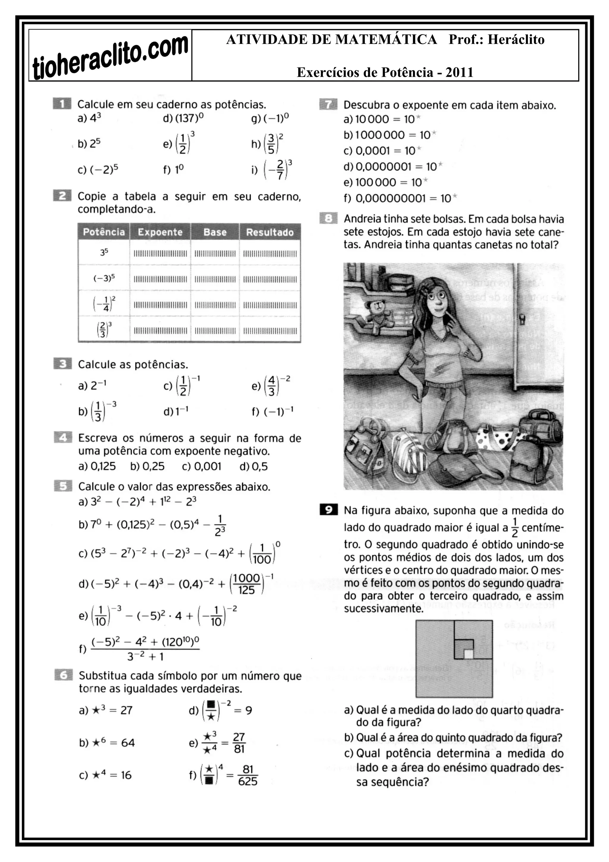 Este documento contém exercícios de potência para o ano de 2011 preparados pelo professor Heráclito.