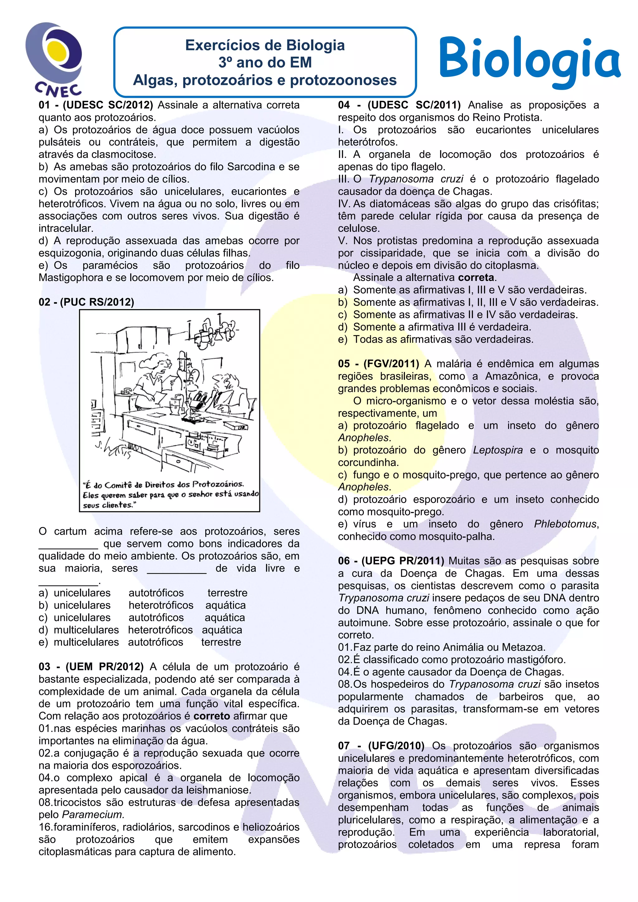 I. O documento discute protozoários e protozoonoses, incluindo questões sobre algas, protozoários e suas doenças. II. Protozoários são eucariontes unicelulares que podem causar doenças como a malária e a doença de Chagas quando transmitidos por vetores como mosquitos. III. O documento fornece exemplos de questões sobre essas doenças para avaliar o conhecimento sobre os protozoários e suas características.