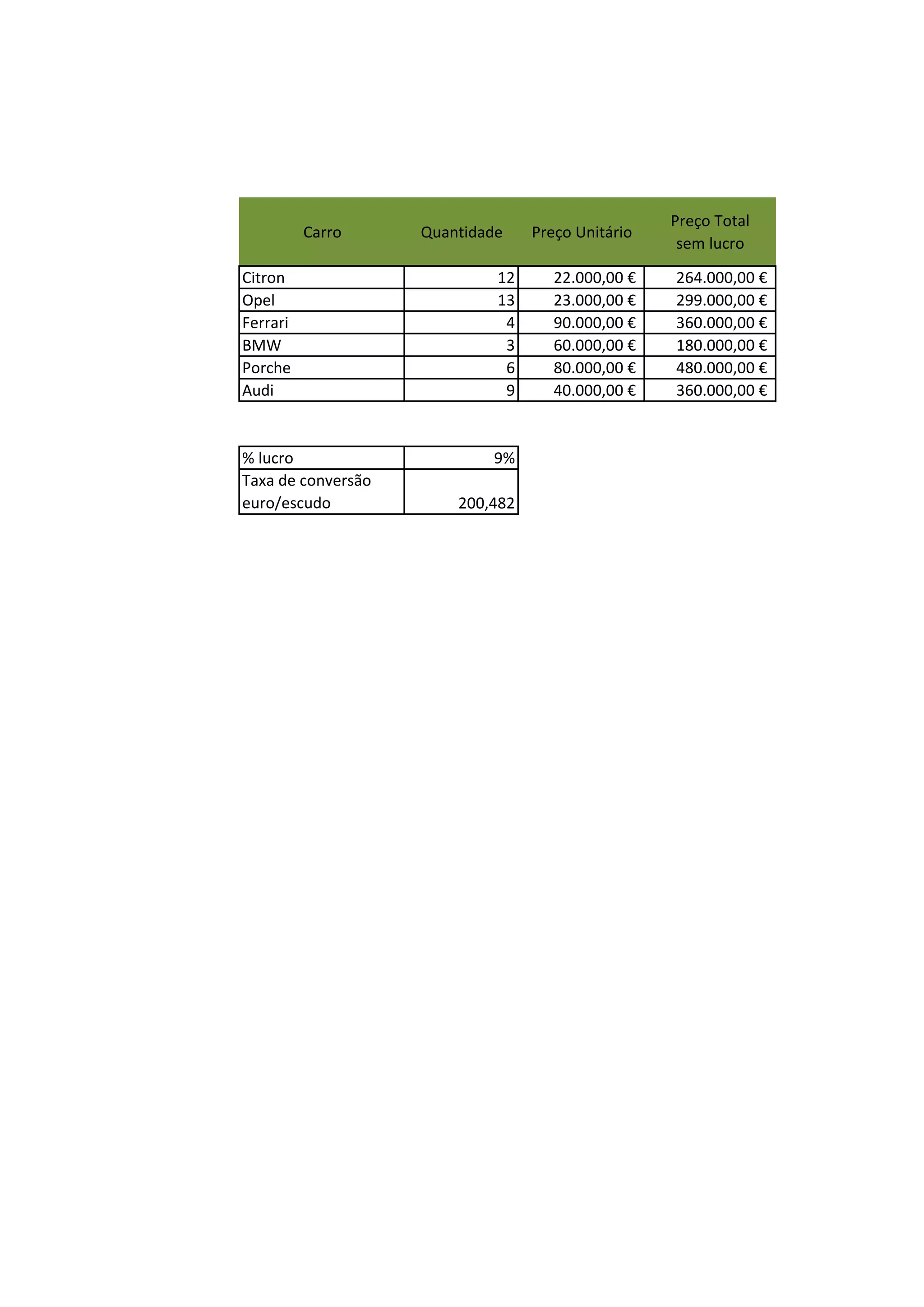 O documento lista o número de veículos vendidos de seis marcas diferentes, seus preços unitários e totais sem e com lucro em euros e em escudos portugueses, com taxas de lucro de 9% e de conversão de 200,482 euros/escudo. A situação de vendas é avaliada como "Bom Trabalho" para Citrön, Opel e Ferrari, e "Temos de vender mais" para BMW, Porsche e Audi.