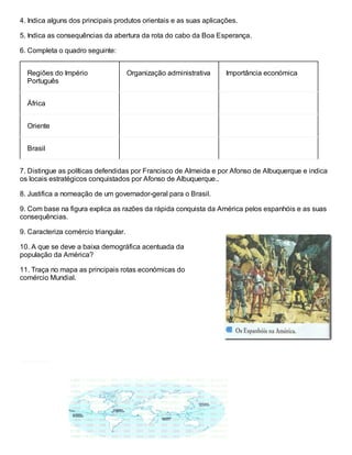 Este documento fornece uma lista de perguntas para uma avaliação sobre o Império Português e a concorrência internacional no século XVI. As perguntas cobrem tópicos como o comércio intercontinental, os produtos trocados entre a Europa, África e América, as consequências da abertura da rota do Cabo da Boa Esperança, a organização administrativa do Império Português em diferentes regiões, e as políticas defendidas por Francisco de Almeida e Afonso de Albuquerque.