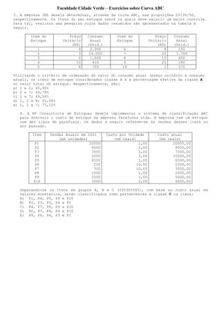 O documento apresenta exercícios sobre análise ABC de estoques para duas empresas. No primeiro exercício, pede-se para fazer a análise ABC de uma tabela com itens e valores de compra. No segundo exercício, pede-se para fazer a análise ABC de uma tabela com itens, consumo anual e preços de uma empresa, informando o grupo A. No terceiro exercício, pede-se para identificar os itens classe A de acordo com dados de estoques de outra empresa.
