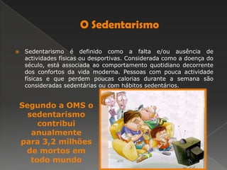 O documento discute os benefícios do exercício físico e os riscos do sedentarismo. Aponta que o sedentarismo está associado a doenças e mortes prematuras. Também descreve como as crianças estão mais sedentárias devido à tecnologia e como o exercício regular traz benefícios físicos e mentais para os jovens.