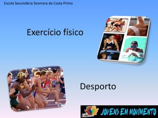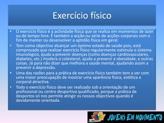 O exercício físico regular tem benefícios para a saúde física e mental, como prevenir doenças e melhorar o humor. Deve ser realizado sob orientação profissional para atingir os objetivos de forma segura. O desporto envolve atividade física regulamentada individual ou em equipe com o objetivo de melhorar habilidades motoras e alcançar bons resultados ou vitórias em competições.