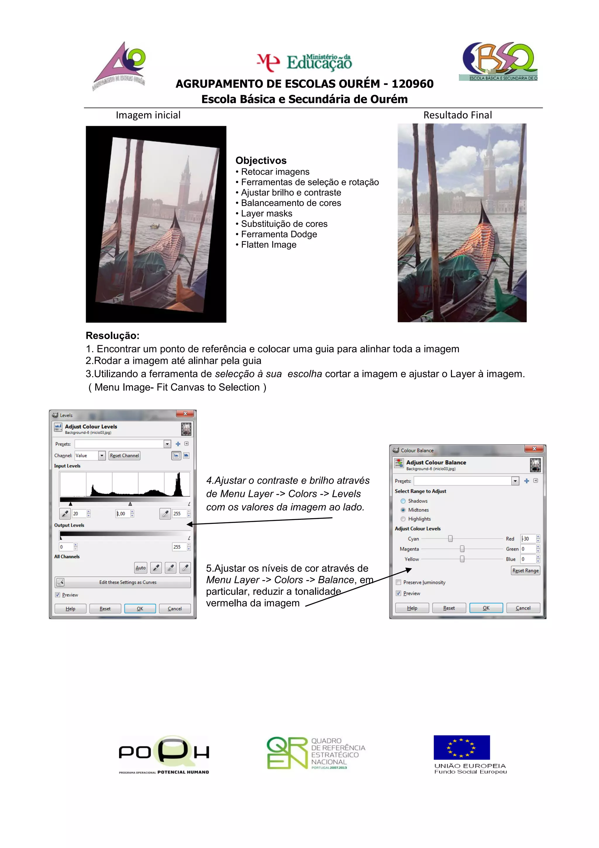 O documento descreve os passos para editar uma imagem usando ferramentas de seleção, rotação, ajuste de brilho, contraste e cores no GIMP. Os objetivos incluem retocar a imagem, substituir cores e remover elementos indesejados.