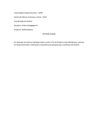 O documento pede aos alunos que construam um texto dissertativo mostrando a importância da pesquisa para professores de história, baseado em duas leituras sobre o assunto.