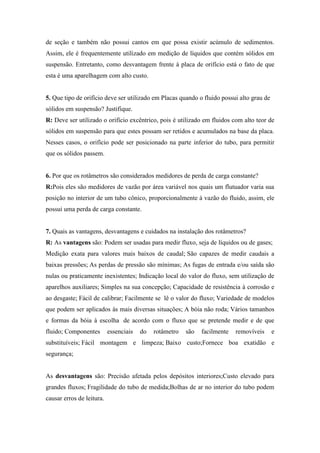 O documento discute diferentes tipos de medidores de vazão, incluindo seus princípios de