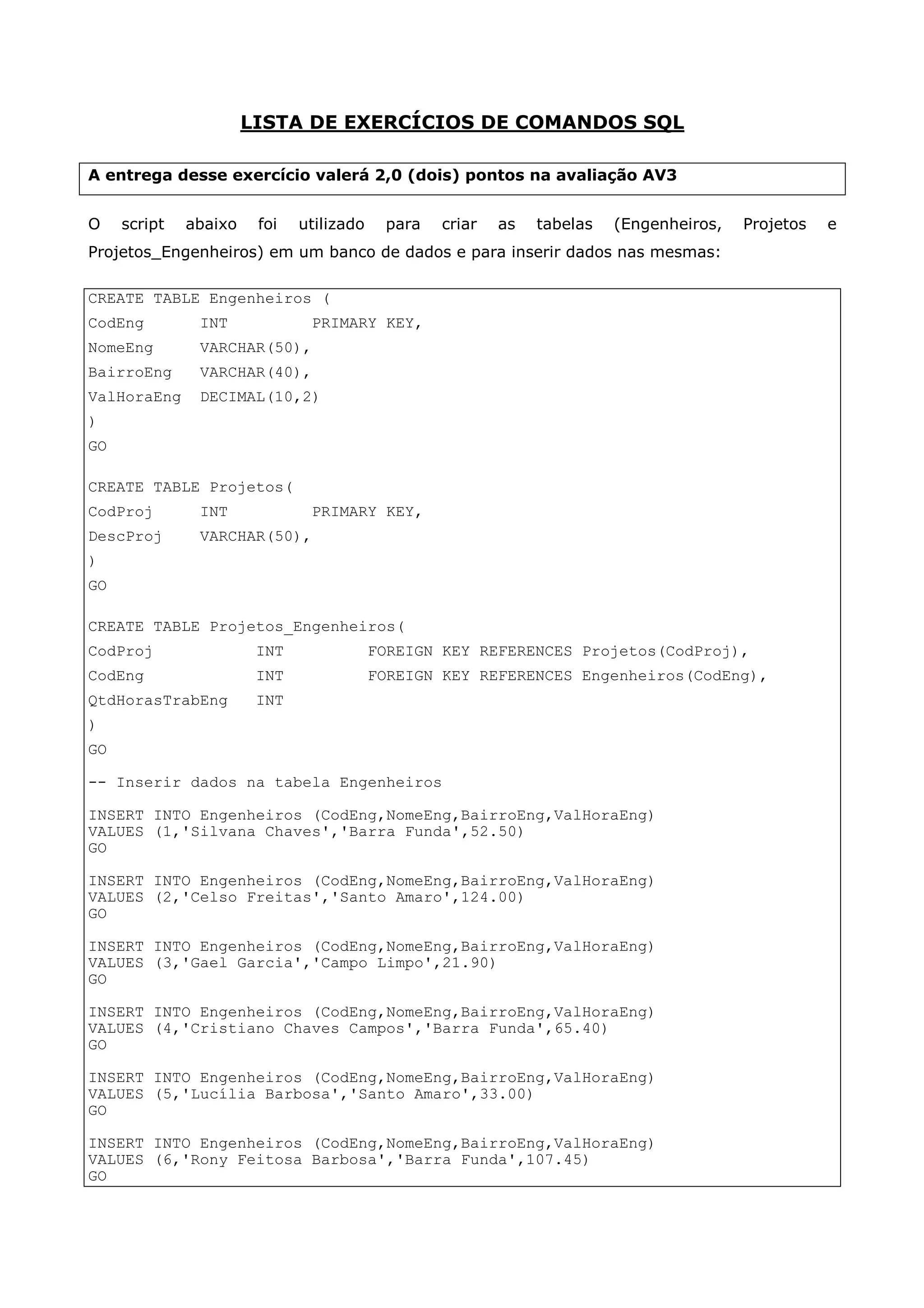 O documento apresenta um script SQL para criar tabelas e inserir dados sobre engenheiros e projetos em um banco de dados. Ele lista 8 exercícios para serem resolvidos usando comandos SQL para recuperar informações dessas tabelas.
