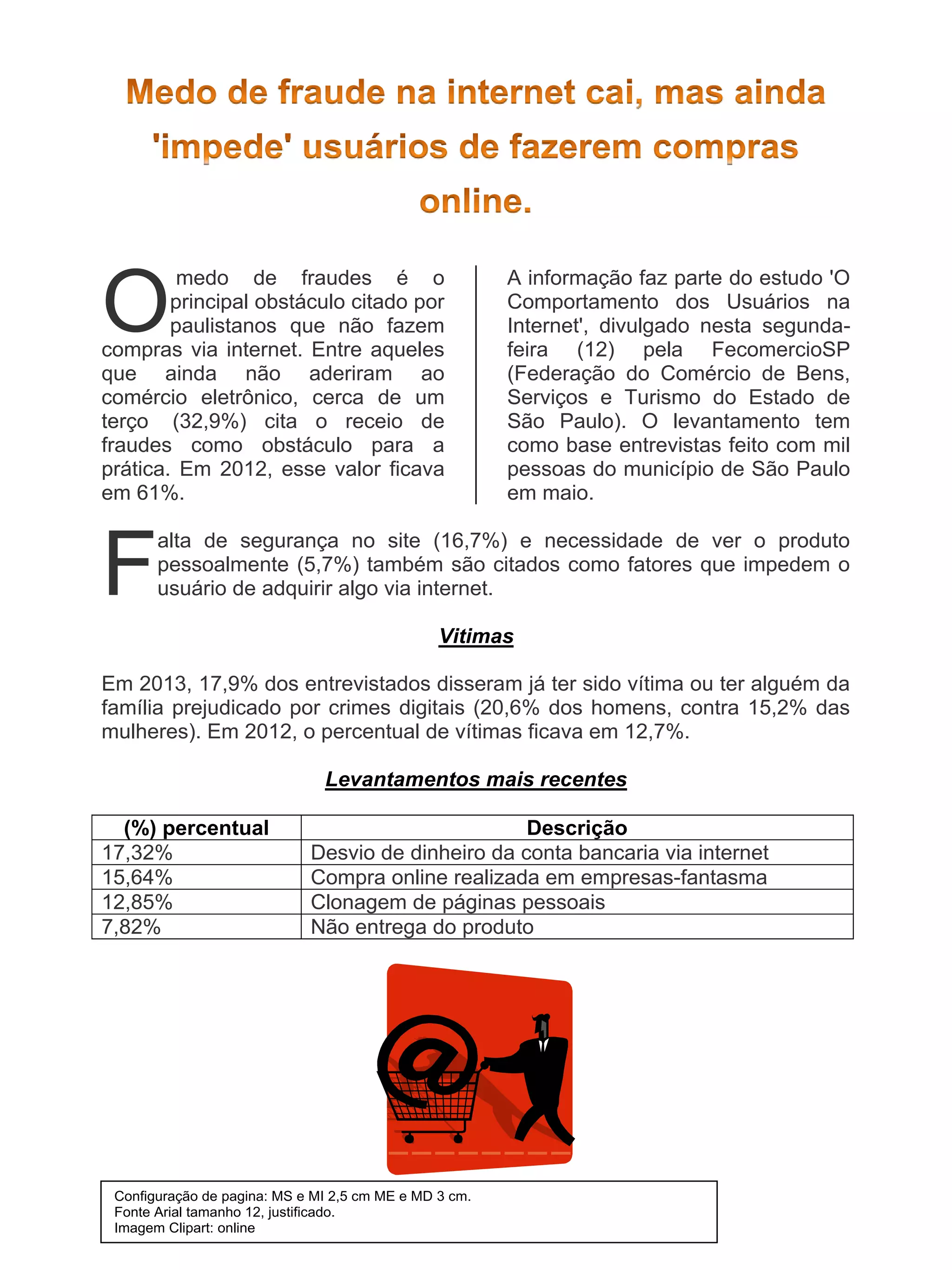 O documento discute os resultados de uma pesquisa sobre o comportamento de usuários da internet em São Paulo. A pesquisa mostra que o medo de fraudes é o principal obstáculo para compras online, citado por 32,9% dos entrevistados. Além disso, a pesquisa revela que o percentual de vítimas de crimes digitais aumentou de 12,7% em 2012 para 17,9% em 2013.
