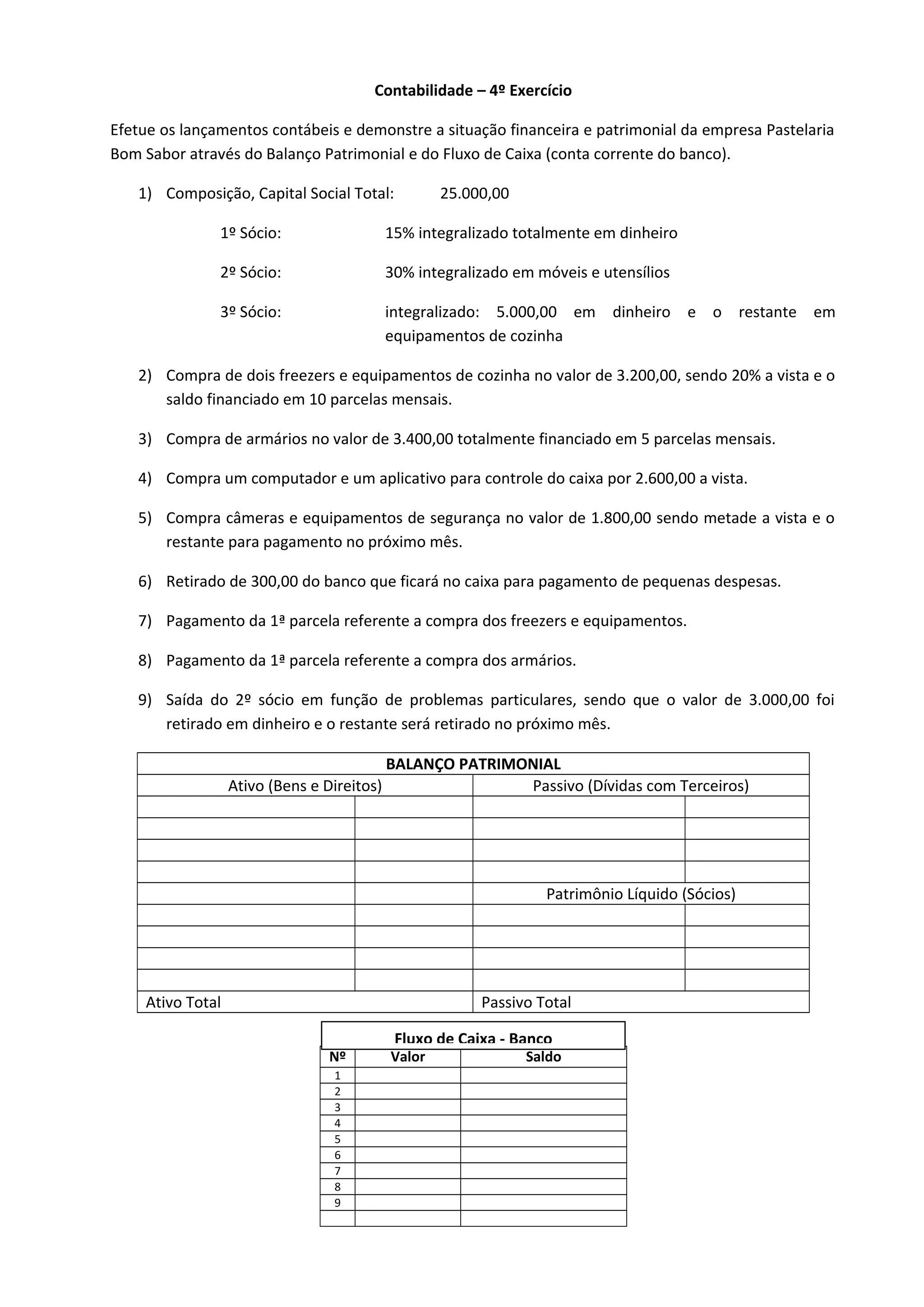 O documento descreve as transações financeiras de uma padaria no mês. Foram realizadas compras de equipamentos, pagamentos de parcelas e saída de um sócio. O balanço patrimonial e fluxo de caixa devem ser demonstrados para apresentar a situação financeira e patrimonial da empresa.