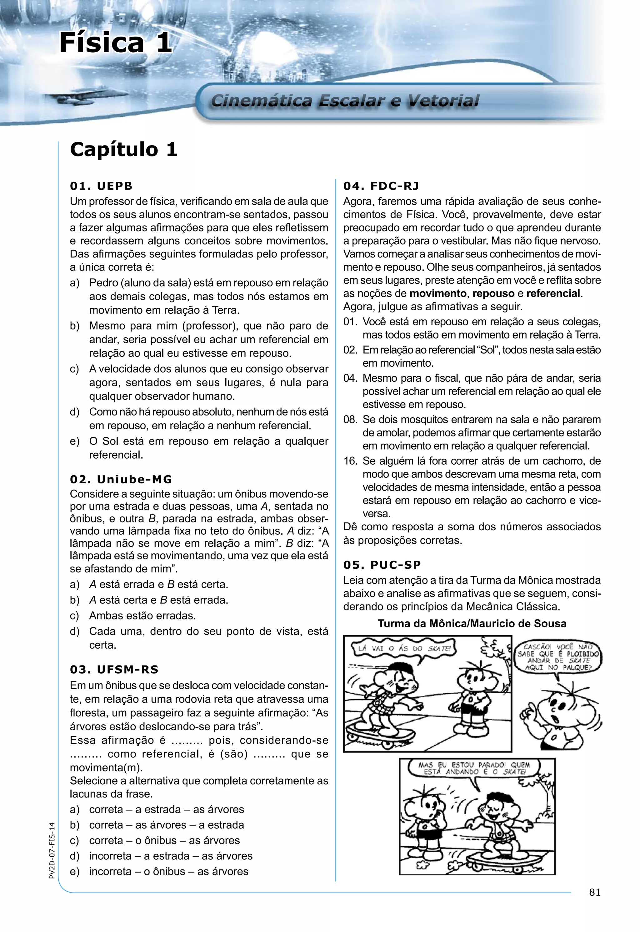 I. O documento discute conceitos de cinemática escalar e vetorial, incluindo movimento, repouso e referenciais. II. Faz afirmações sobre esses conceitos para os estudantes avaliarem. III. Pede aos estudantes para somarem os números associados às proposições corretas.