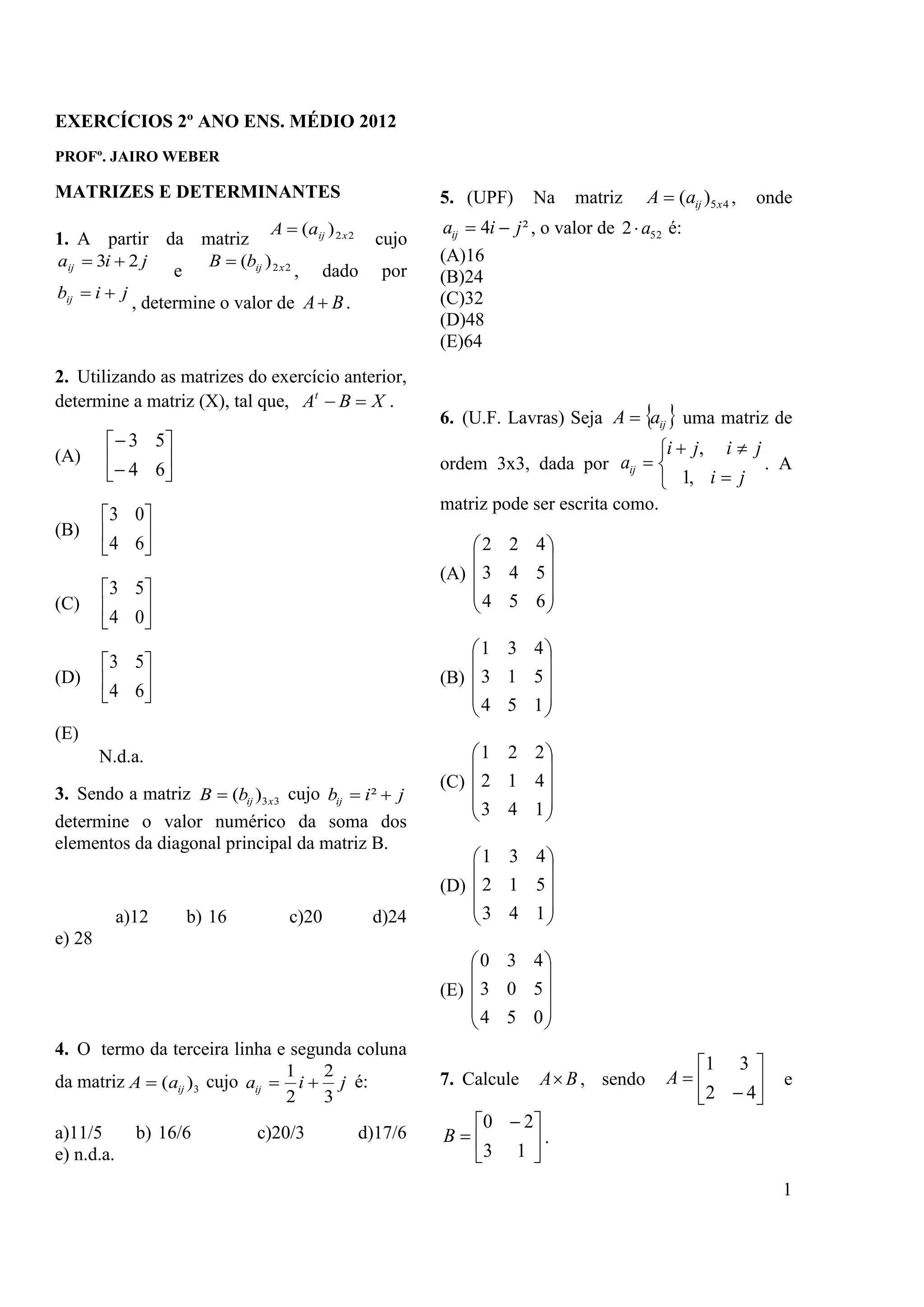 1) O documento apresenta uma série de exercícios sobre matrizes, determinantes e sistemas lineares. 2) Os exercícios envolvem cálculo de determinantes, produto e inversa de matrizes, resolução de sistemas lineares e equações. 3) As questões apresentam diferentes níveis de complexidade e abordam conceitos fundamentais de álgebra linear.