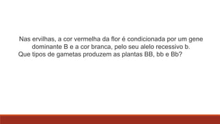 1) O documento discute conceitos genéticos como alelos dominantes e recessivos, cruzamentos e herança de características. 2) Inclui situações-problema sobre herança de cor de flores em ervilhas, pelagem em cobaias e bovinos. 3) Aborda também a interação entre genótipo e ambiente e proporções em cruzamentos.