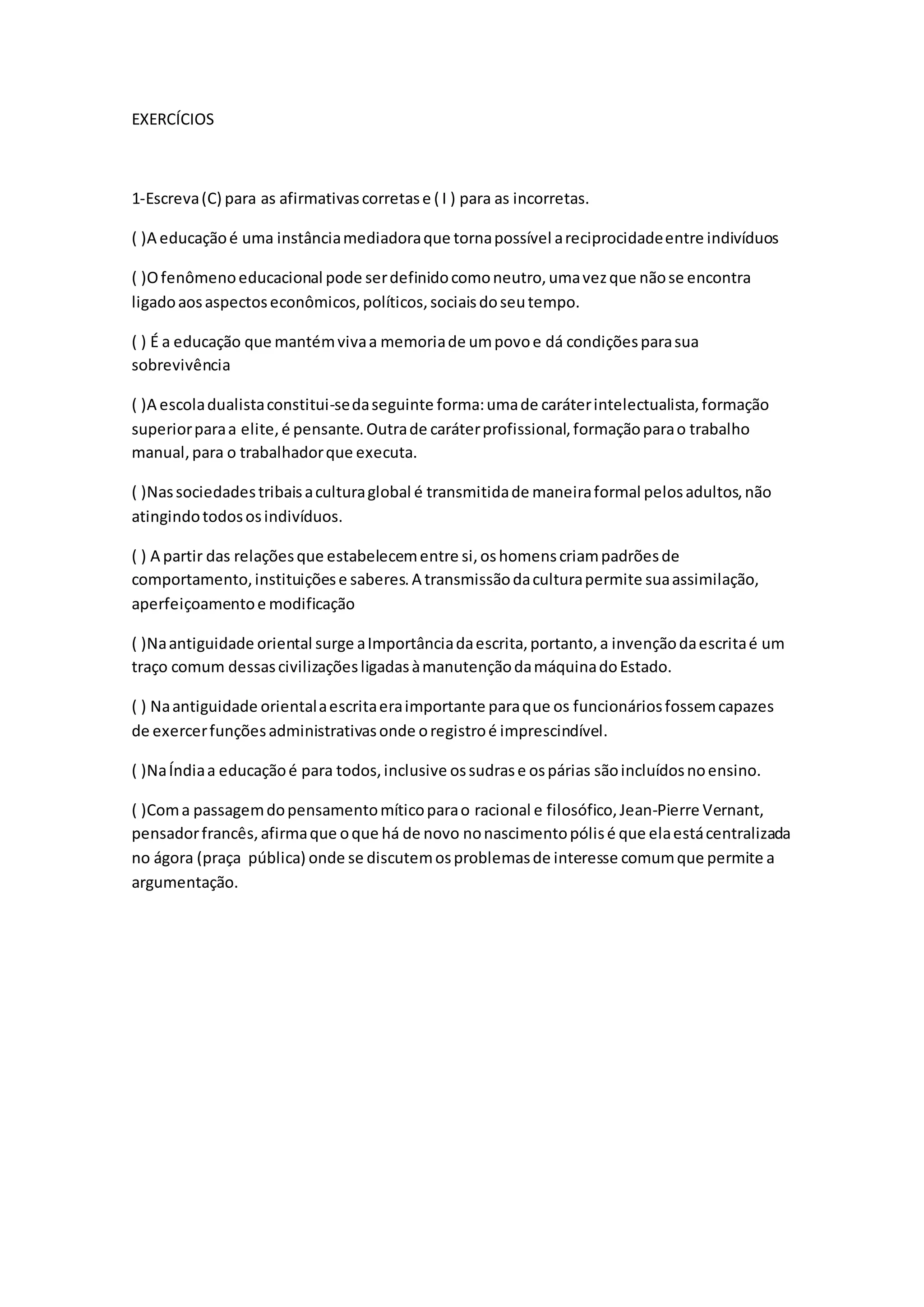 (1) A educação é uma instância mediadora que torna possível a reciprocidade entre indivíduos e é o que mantém viva a memória de um povo e dá condições para sua sobrevivência. (2) Na antiguidade oriental a escrita era importante para que os funcionários fossem capazes de exercer funções administrativas. (3) Na Grécia antiga, a educação estava centrada na formação intelectual para a elite pensante.