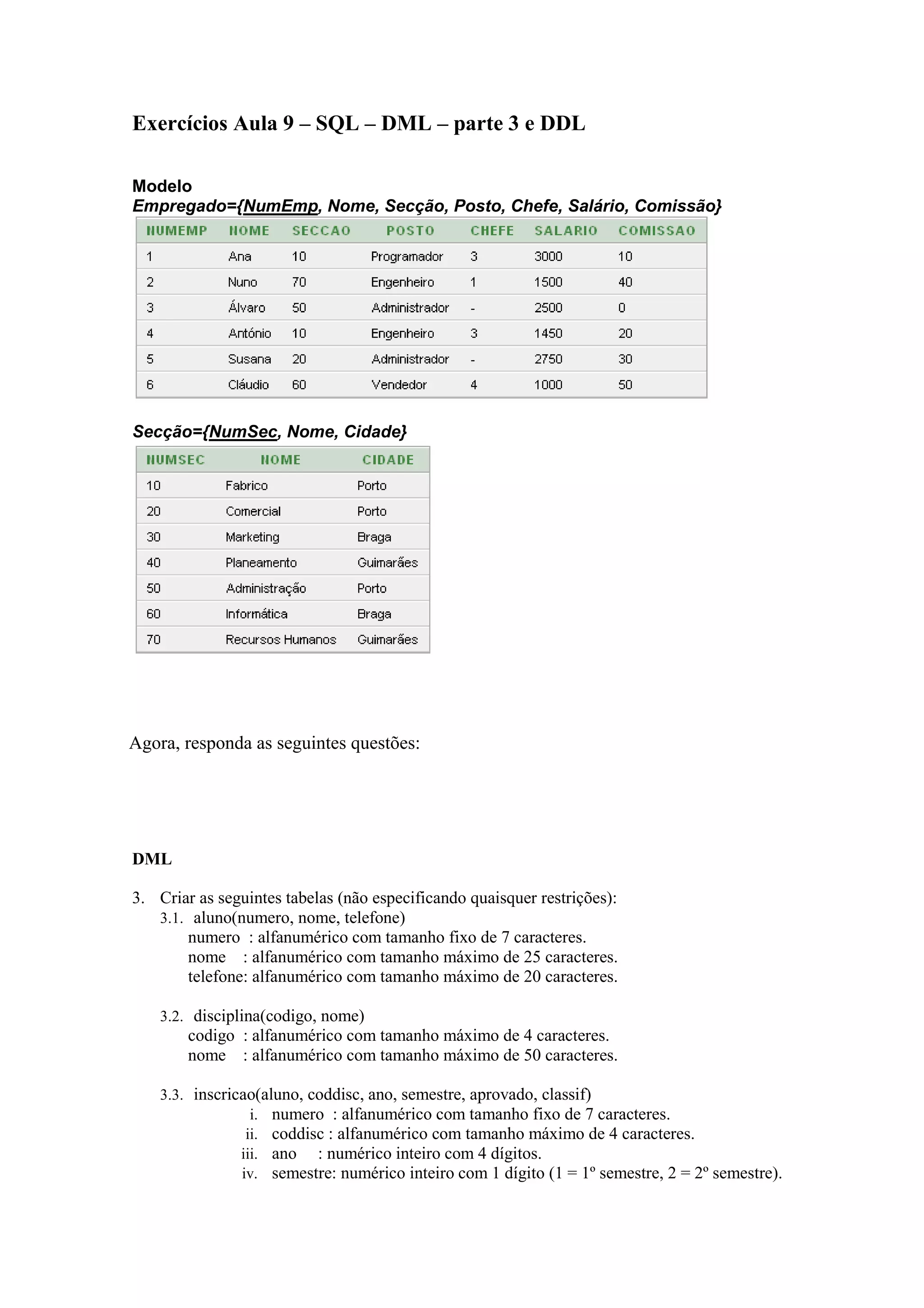 1) O documento descreve a criação de tabelas para um banco de dados de alunos e disciplinas, com colunas, tipos de dados e restrições.
