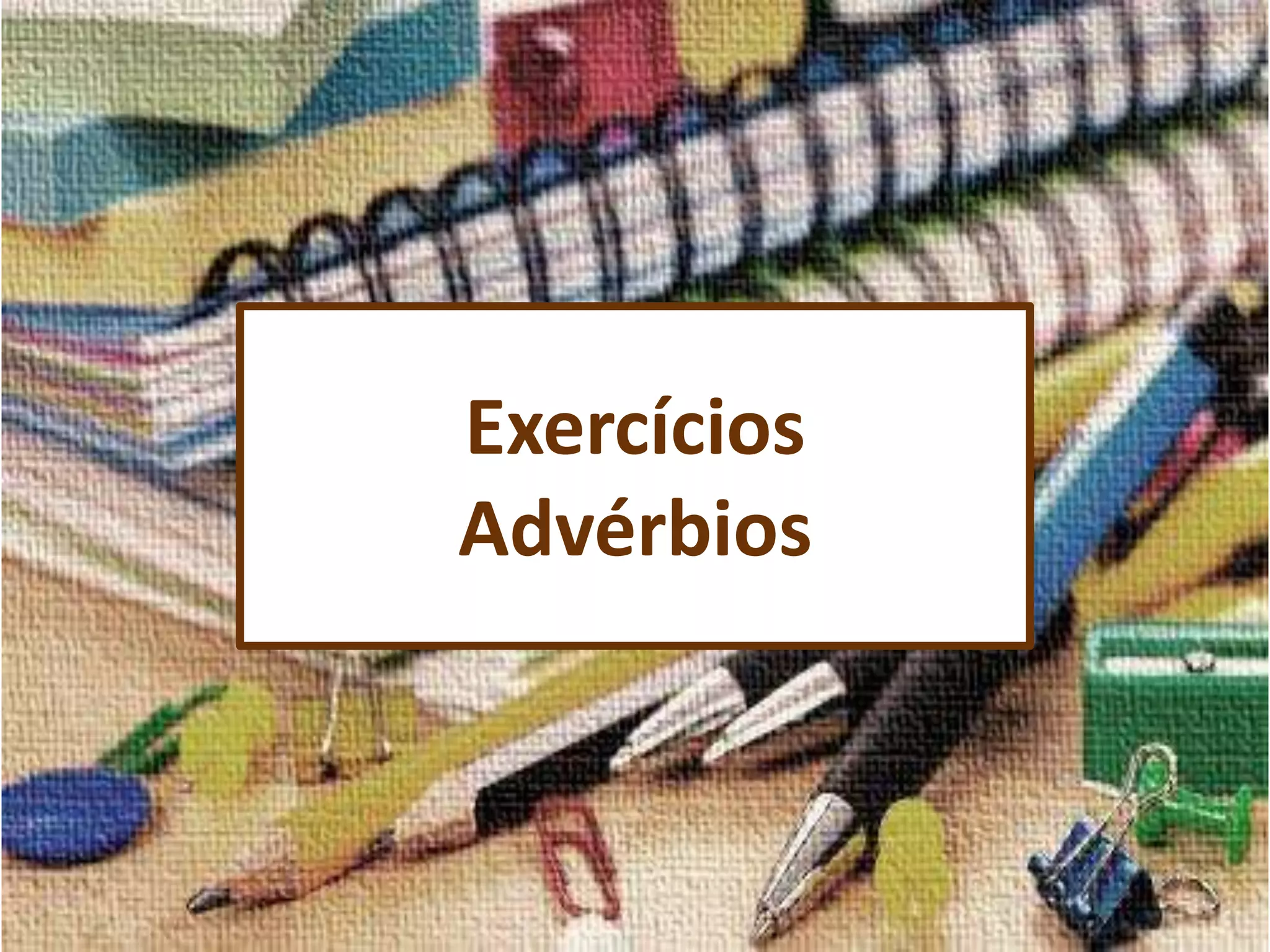 O documento contém 4 questões sobre classificação e identificação de advérbios. A primeira questão pede para classificar 5 advérbios por tipo (tempo, modo, intensidade, negação e dúvida). A segunda e terceira perguntam identificar exemplos de advérbios de modo e identificar quais opções não contém um advérbio. A quarta questão pede para classificar um advérbio por tipo.