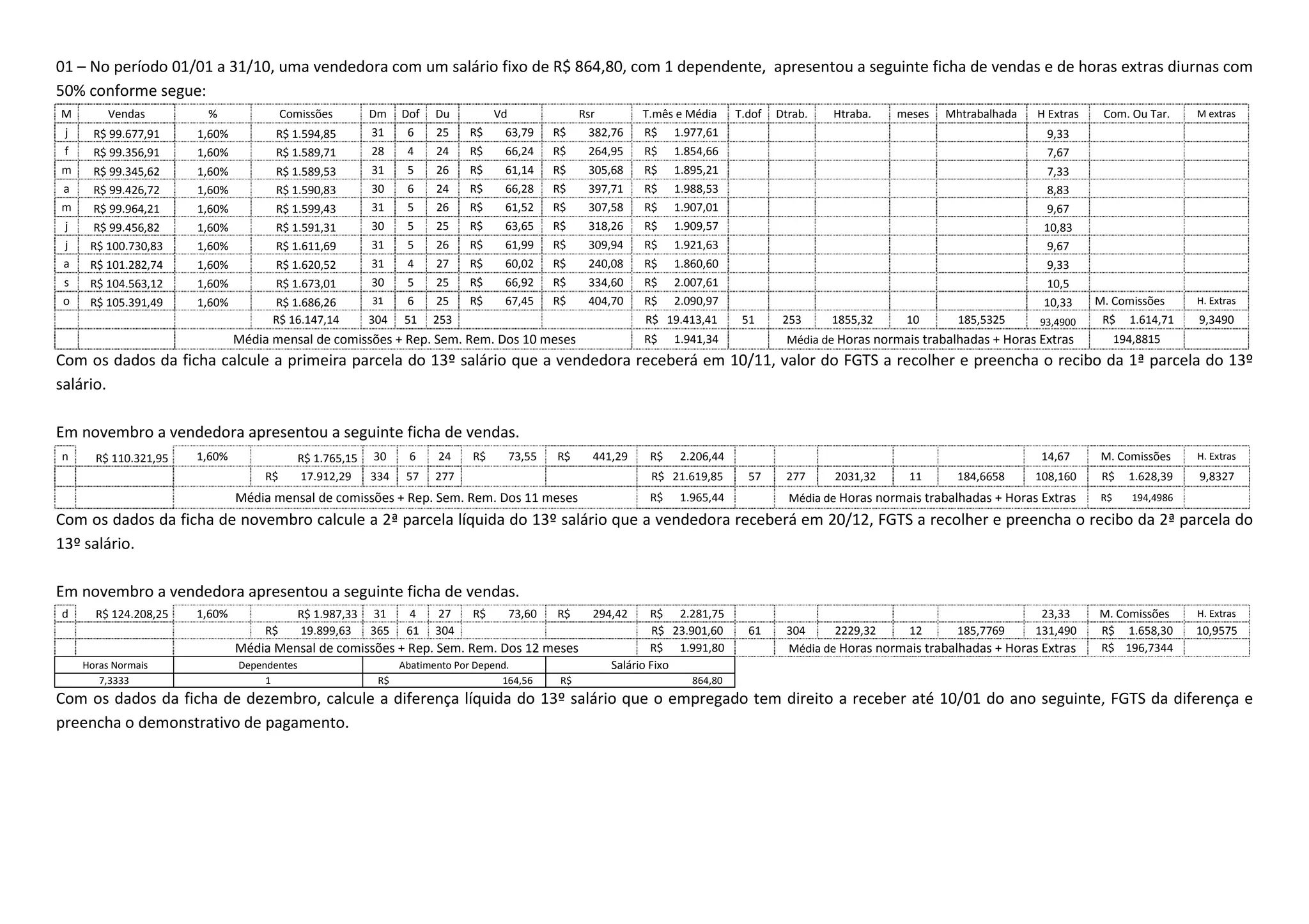 01 – Noperíodo 01/01 a 31/10, uma vendedora com um salário fixo de R$ 864,80, com 1 dependente, apresentou a seguinte ficha de vendas e de horas extras diurnas com