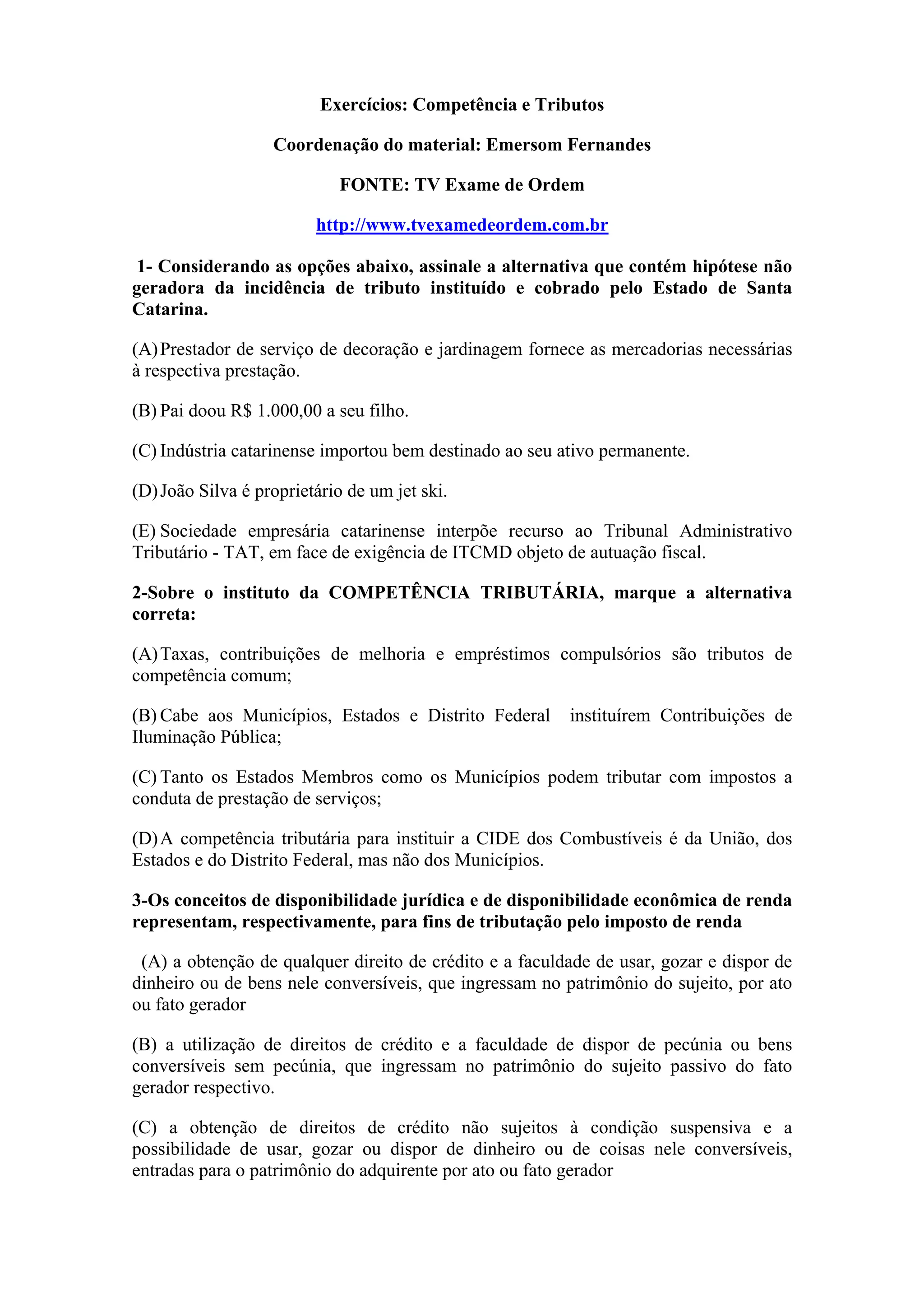 Este documento contém 14 questões sobre competência tributária e tributos no Brasil de acordo com a Constituição Federal. As questões abordam tópicos como quais entes da federação (União, estados, DF e municípios) podem instituir cada tipo de tributo, como ICMS, IPI, ISS, IPVA etc. e quais matérias precisam ser reguladas por lei complementar no caso do ICMS. O documento também fornece o gabarito das questões.
