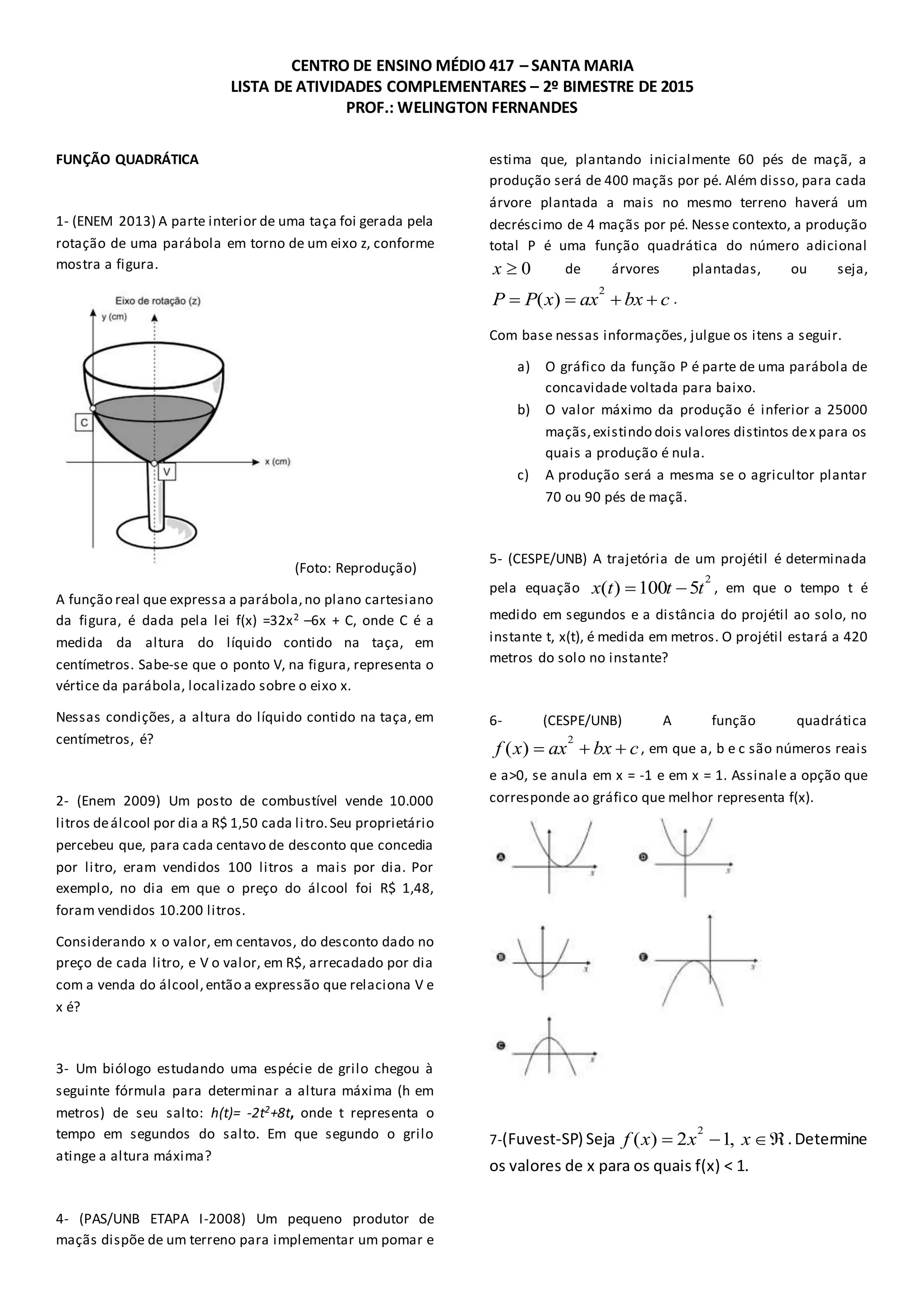 1) A função que expressa a parábola na figura é f(x) = 32x2 - 6x + C, onde C representa a altura do líquido na taça em centímetros.
