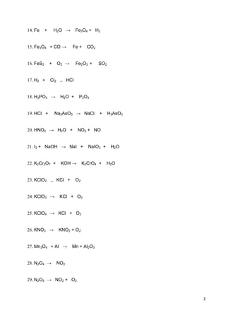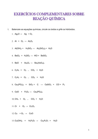 1. O documento pede para balancear equações químicas, circular óxidos e grifar hidróxidos. Também pede para identificar substâncias em frascos após testes.