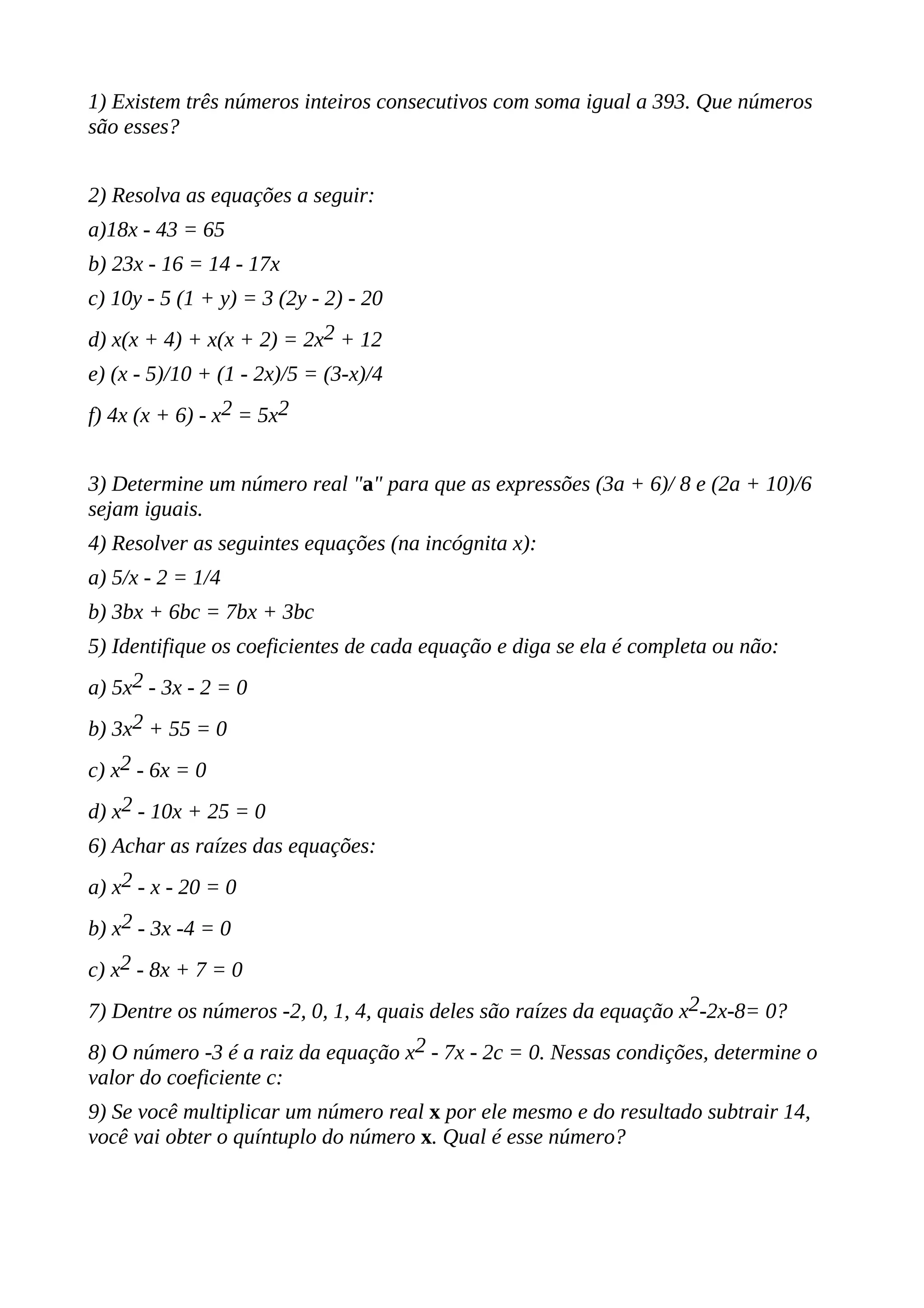 1) Os três números inteiros consecutivos com soma igual a 393 são 130, 131 e 132. 2) Resolva as equações a seguir: a) 18x - 43 = 65; x = 4 b) 23x - 16 = 14 - 17x; x = 2 c) 10y - 5 (1 + y) = 3 (2y - 2) - 20; y = 2 d) x(x + 4) + x(x + 2) = 2x2 + 12; x = 2 e) (x - 5)/10 + (1 - 2x)/5 = (3-x)/4; x