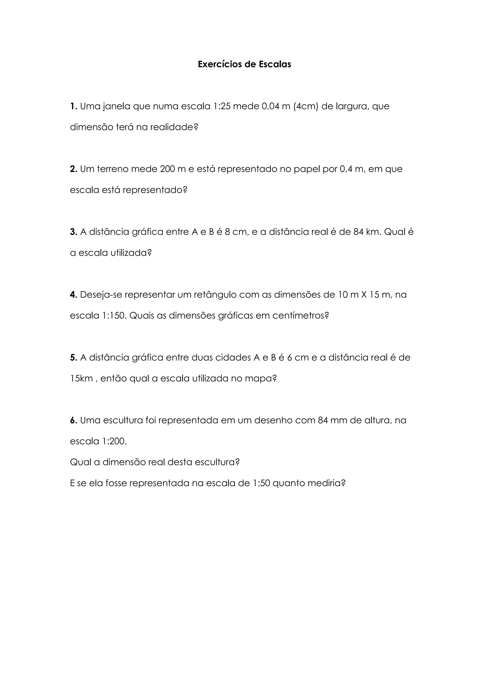 Este documento apresenta 6 exercícios sobre escalas que envolvem conversão de medidas gráficas em medidas reais e vice-versa usando diferentes escalas como 1:25, 1:150, 1:200 e 1:50. Os exercícios abordam conversão de medidas de largura de janelas, terrenos, distâncias entre cidades e dimensões de esculturas.