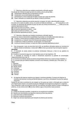 2) Foi realizada uma experiência para analisar o efeito do álcool na fluidez das membranas das plaquetas. Os resultados mostraram que a fluidez aumentou nos indivíduos que pararam de consumir álcool.