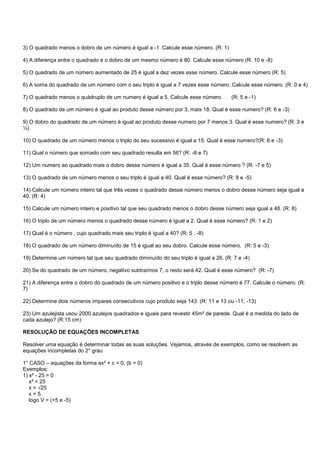 O documento apresenta uma série de exercícios de equações de 2o grau para serem resolvidos. Estes incluem calcular raízes de equações, resolver equações de 2o grau isolando as variáveis e determinando seus valores e resolver problemas envolvendo equações de 2o grau.