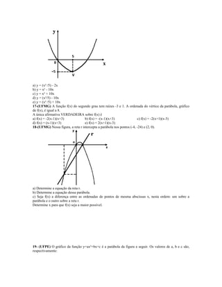 2. As questões abordam conceitos como equações de parábolas, identificação de pontos importantes dos gráficos e resolução de problemas envolvendo funções quadráticas.