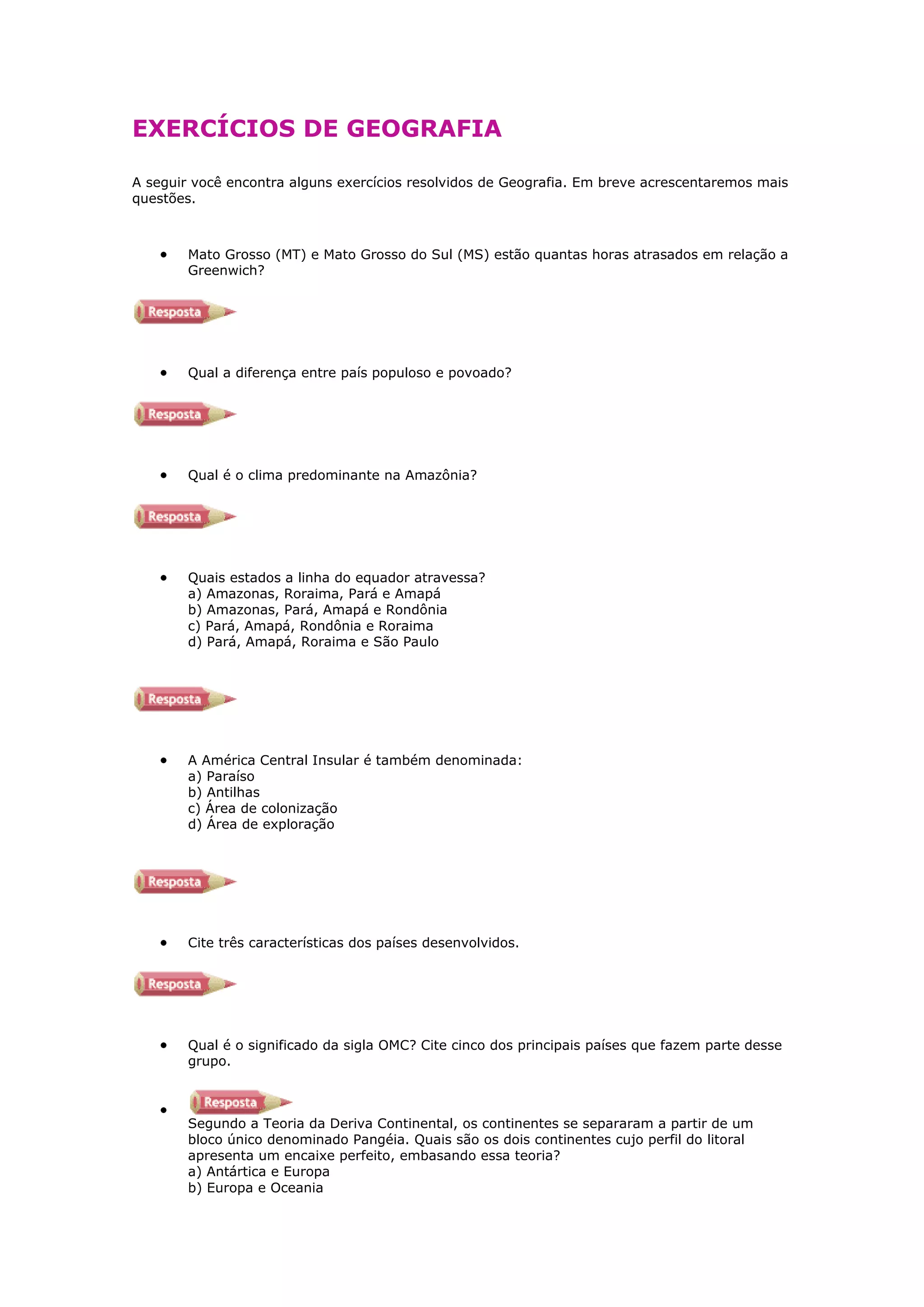 Este documento fornece uma série de exercícios de geografia com perguntas sobre regiões e conceitos geográficos como: a diferença entre país populoso e povoado; o clima predominante na Amazônia; os estados cortados pela linha do equador; a denominação da América Central Insular; características dos países desenvolvidos; o significado da sigla OMC e países membros; continentes cujos litorais encaixam perfeitamente segundo a Teoria da Deriva Continental; e a bacia planáltica situada no plan