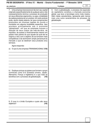 Este documento contém uma prova de geografia para alunos do 8o ano do ensino fundamental. A prova inclui instruções gerais, como preencher o cabeçalho e usar caneta azul ou preta. Também contém 9 questões objetivas sobre tópicos como globalização, empresas transnacionais e blocos econômicos.