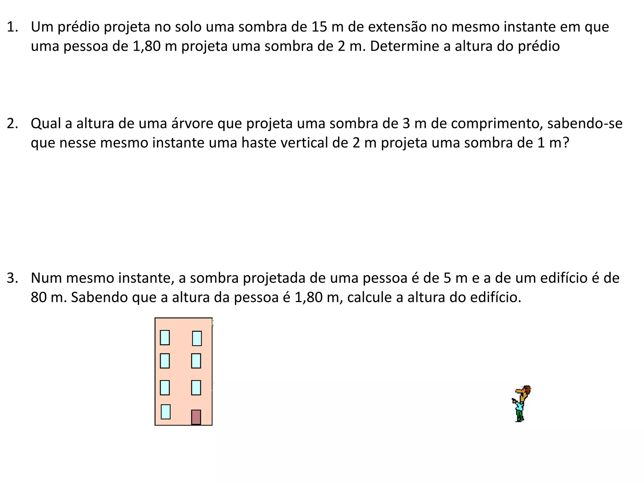 1. O prédio tem 30 m de altura, já que projeta uma sombra 15 vezes maior que a pessoa de 1,8 m que projeta uma sombra de 2 m.