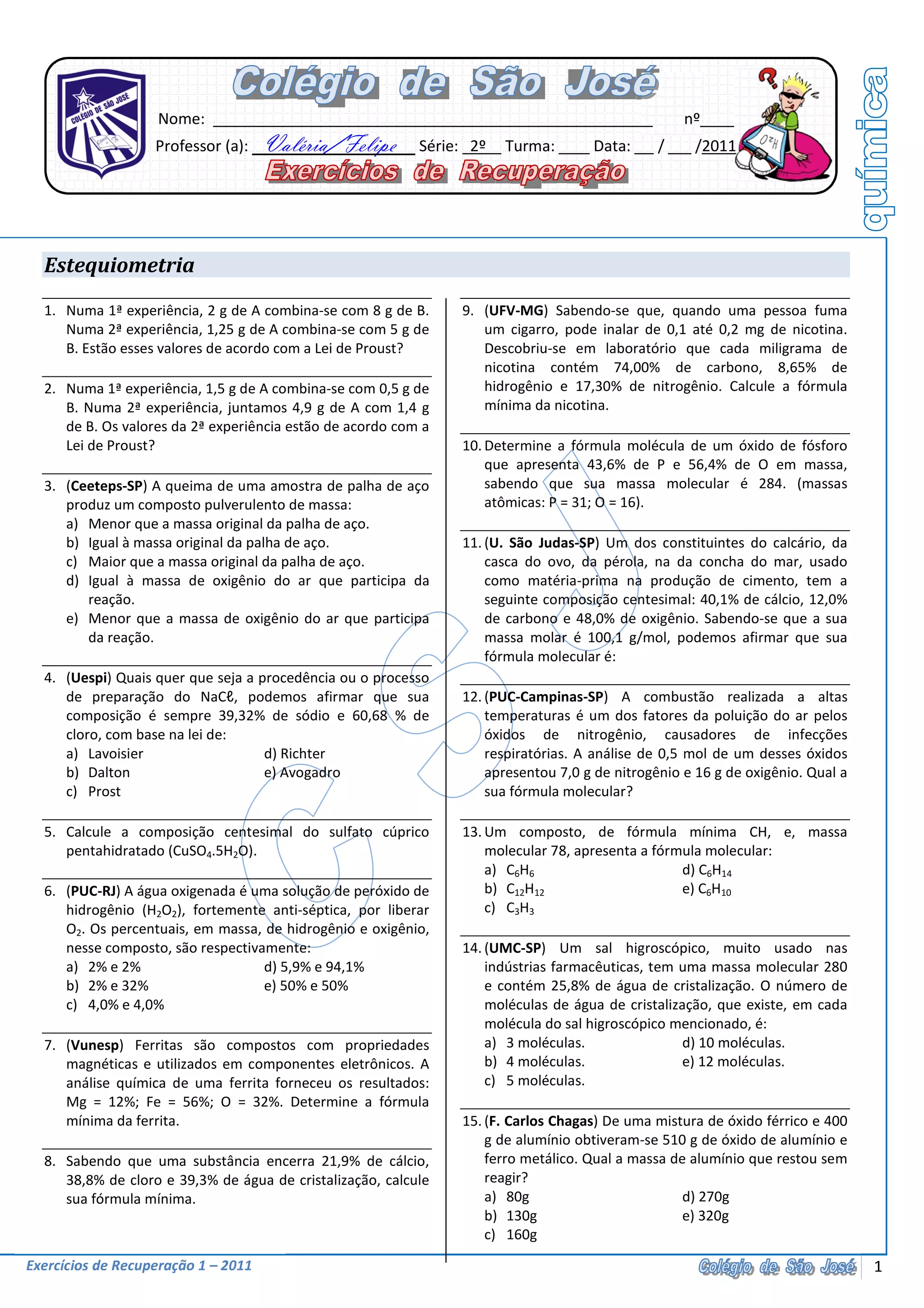 1. Numa 1ª experiência, 2 g de A combina-se com 8 g de B. 9. (UFV-MG) Sabendo-se que, quando uma pessoa fuma