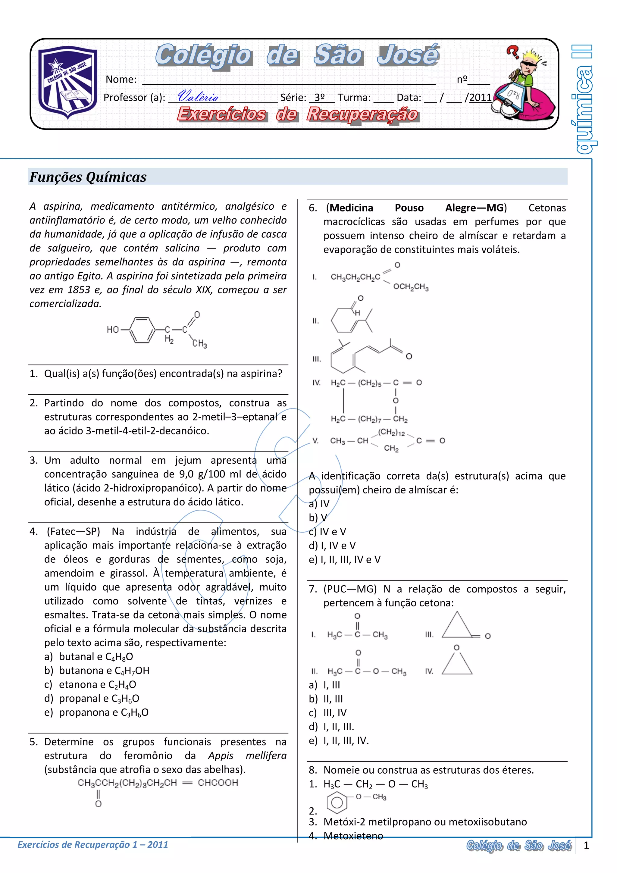 O documento apresenta um resumo sobre funções químicas e compostos orgânicos. Aborda a estrutura e propriedades da aspirina, cetonas usadas em perfumes, ácido lático no sangue humano, solventes orgânicos e feromônios de abelhas. Também descreve um fungo capaz de produzir compostos voláteis com cheiro de frutas que podem ser usados como aromatizantes naturais.