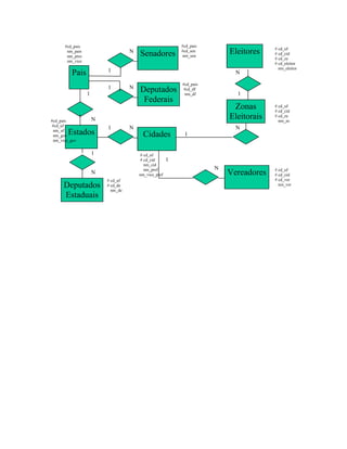 1) O documento apresenta três modelos de relacionamento: um sobre o sistema eleitoral brasileiro com as entidades envolvidas no processo de votação, um sobre uma instituição financeira com holding, bancos, agências, clientes e contas, e um sobre uma locadora de vídeo com clientes, fornecedores e operações de aluguel de fitas.