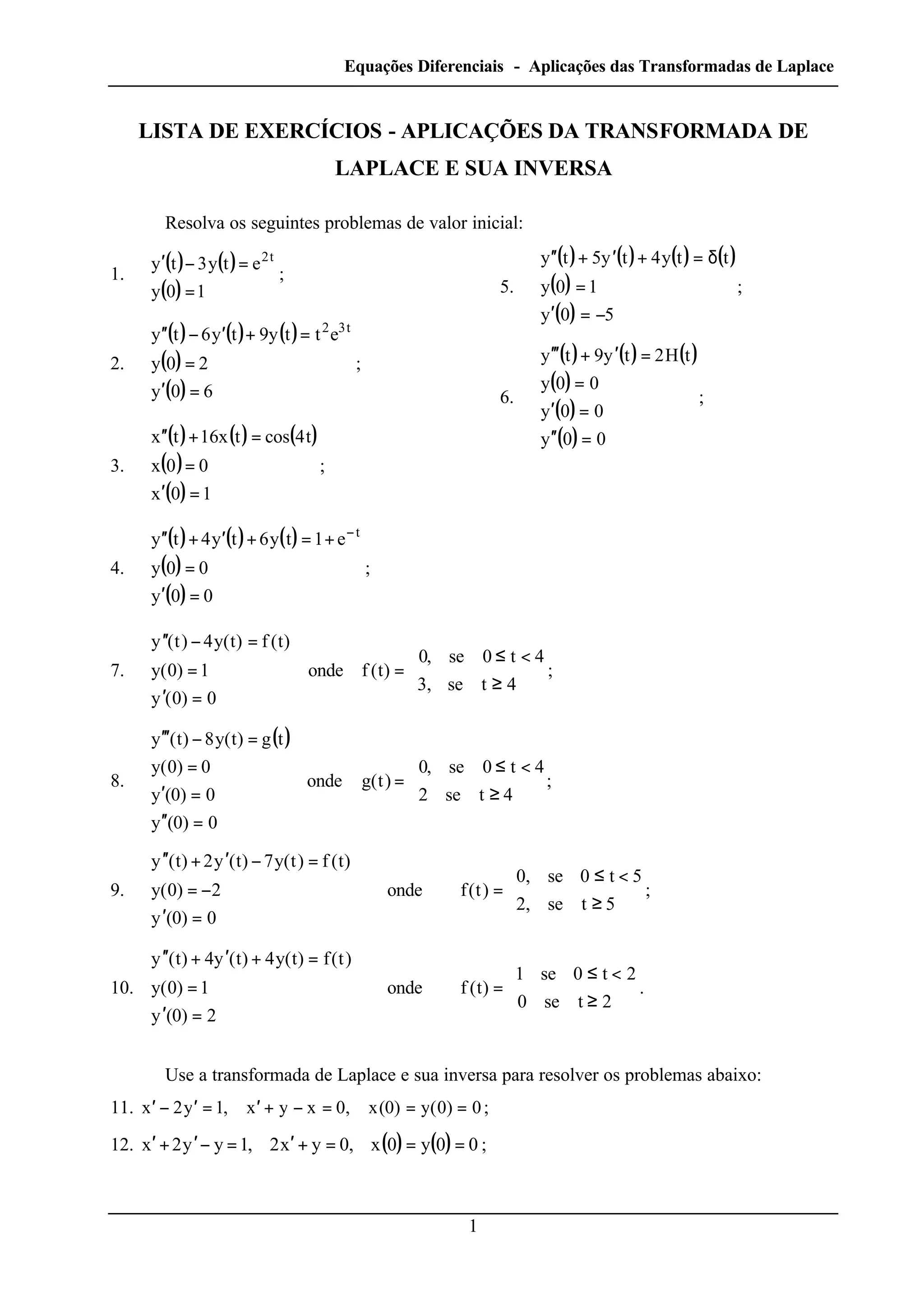 1) O documento apresenta uma lista de exercícios sobre aplicações da transformada de Laplace e sua inversa para resolver problemas de valor inicial envolvendo equações diferenciais.