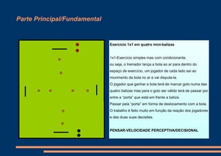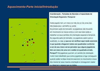 Este documento descreve dois exercícios de treino para trabalhar a coordenação, orientação espacial e temporal de jogadores de futebol. No primeiro exercício, os jogadores trocam mecos de cores diferentes e depois vão para quadrados correspondentes às cores, testando sua capacidade de orientação. No segundo exercício, jogadores disputam uma bola lançada no ar e tentam marcar gols passando por "portas" em frente às balizas, trabalhando sua reação e tomada de decisão.