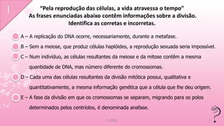 [1] O documento discute os processos de divisão celular mitose e meiose. [2] A mitose ocorre em células somáticas e produz duas células idênticas, enquanto a meiose ocorre em células germinativas e produz quatro células com metade do número de cromossomas. [3] O documento fornece afirmações sobre mitose e meiose e pede para identificar quais são corretas e incorretas.