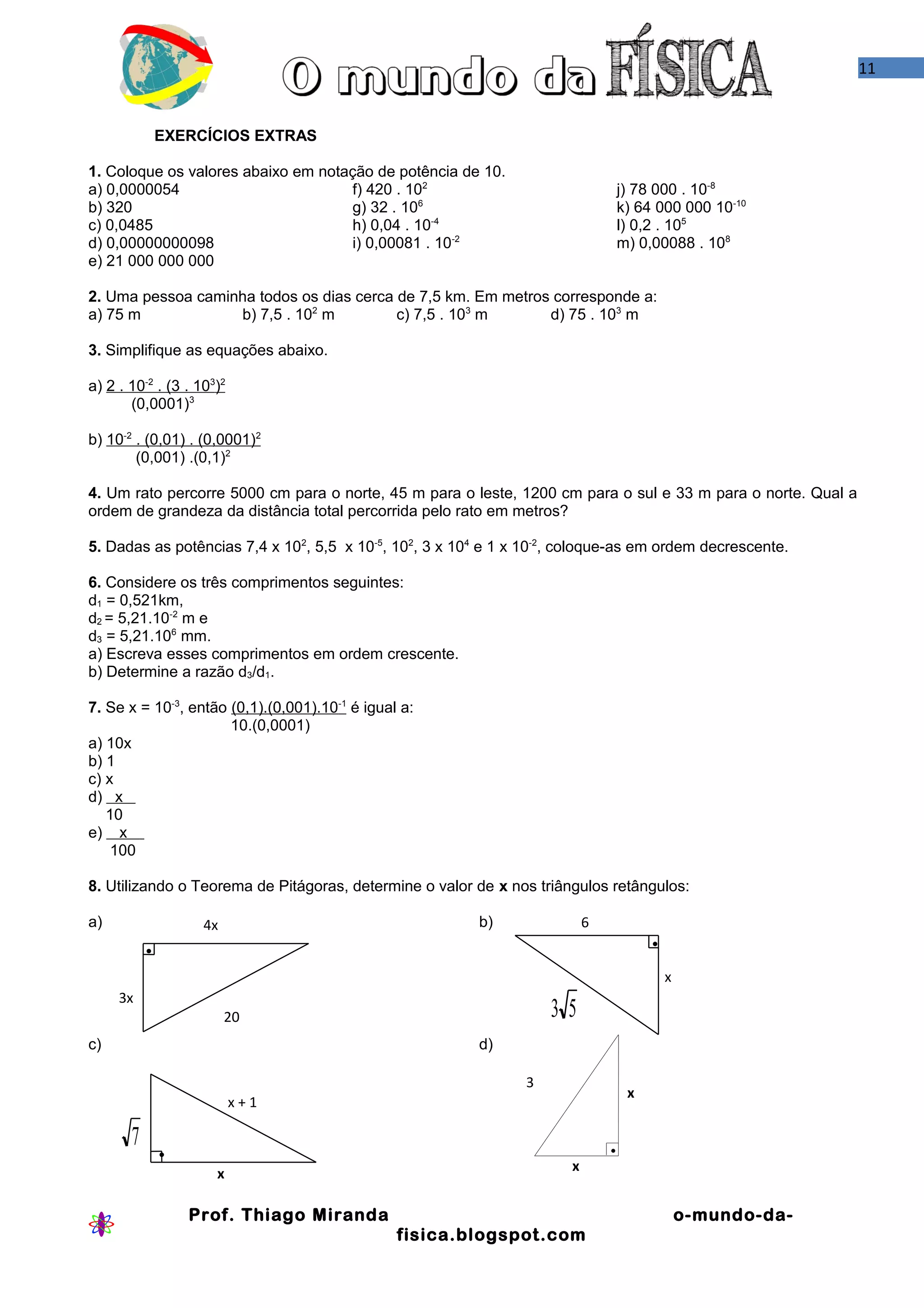 O documento apresenta 12 exercícios de física que envolvem operações com notação científica, cálculo de distâncias, uso do Teorema de Pitágoras e cálculo de ângulos e alturas usando trigonometria. As respostas são fornecidas no gabarito no final.