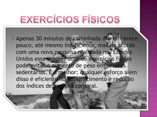Uma pesquisa nos EUA descobriu que apenas 30 minutos de caminhada por dia pode evitar ganho de peso em pessoas sedentárias, e qualquer atividade física adicional é eficiente para emagrecer. Caminhar 16-20km por semana, o equivalente a 30 minutos por dia, é suficiente para compensar ganhos pequenos de peso causados por inatividade. Exercícios aeróbicos, bicicleta, musculação, alongamento e yoga trazem muitos benefícios para a saúde física e mental.