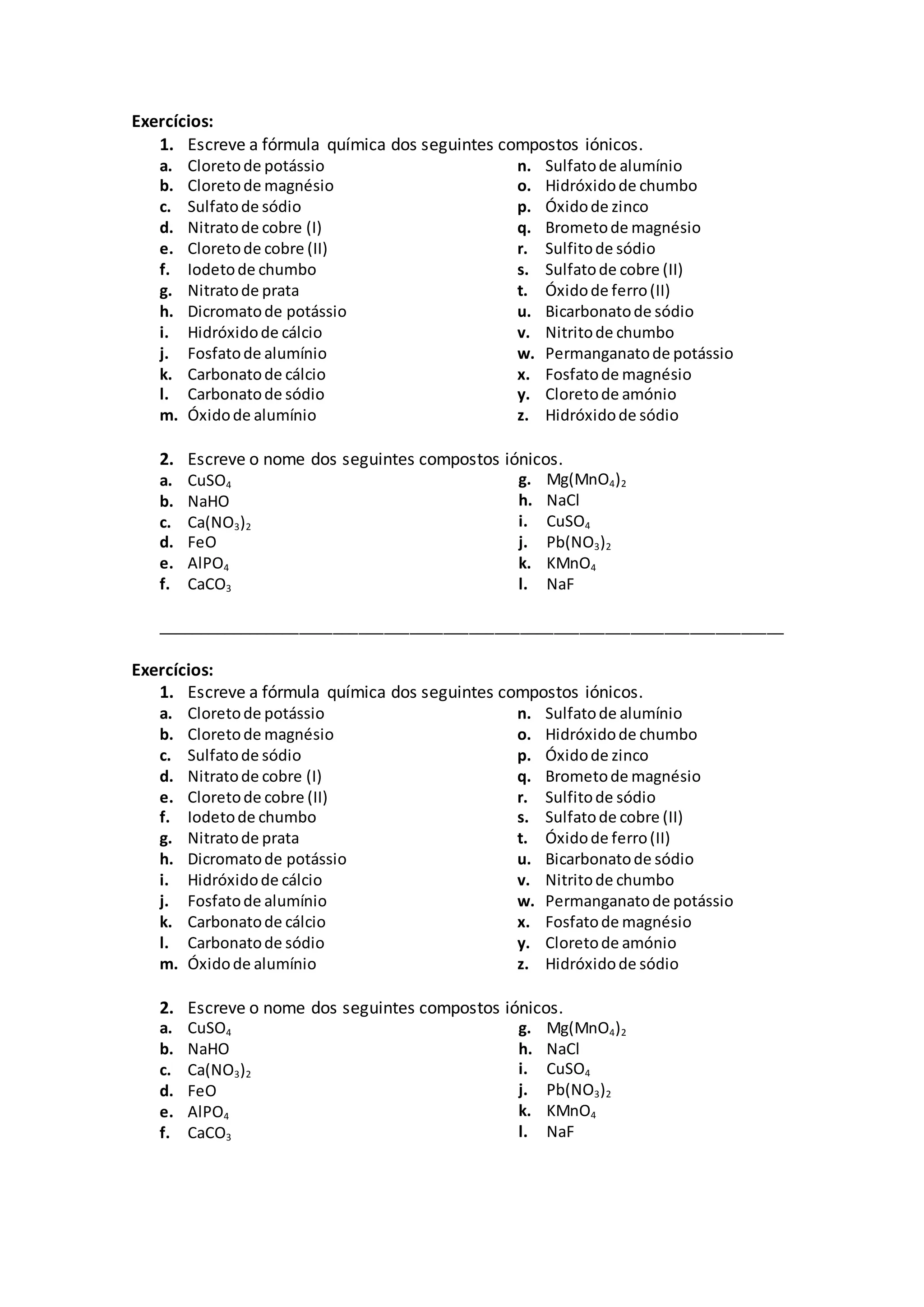 O documento apresenta um conjunto de exercícios químicos para escrever fórmulas químicas e nomes de compostos iônicos. Na primeira parte, pede-se para escrever a fórmula química de 26 compostos iônicos diferentes. Na segunda parte, pede-se para escrever o nome de 14 compostos iônicos dados por suas fórmulas químicas.