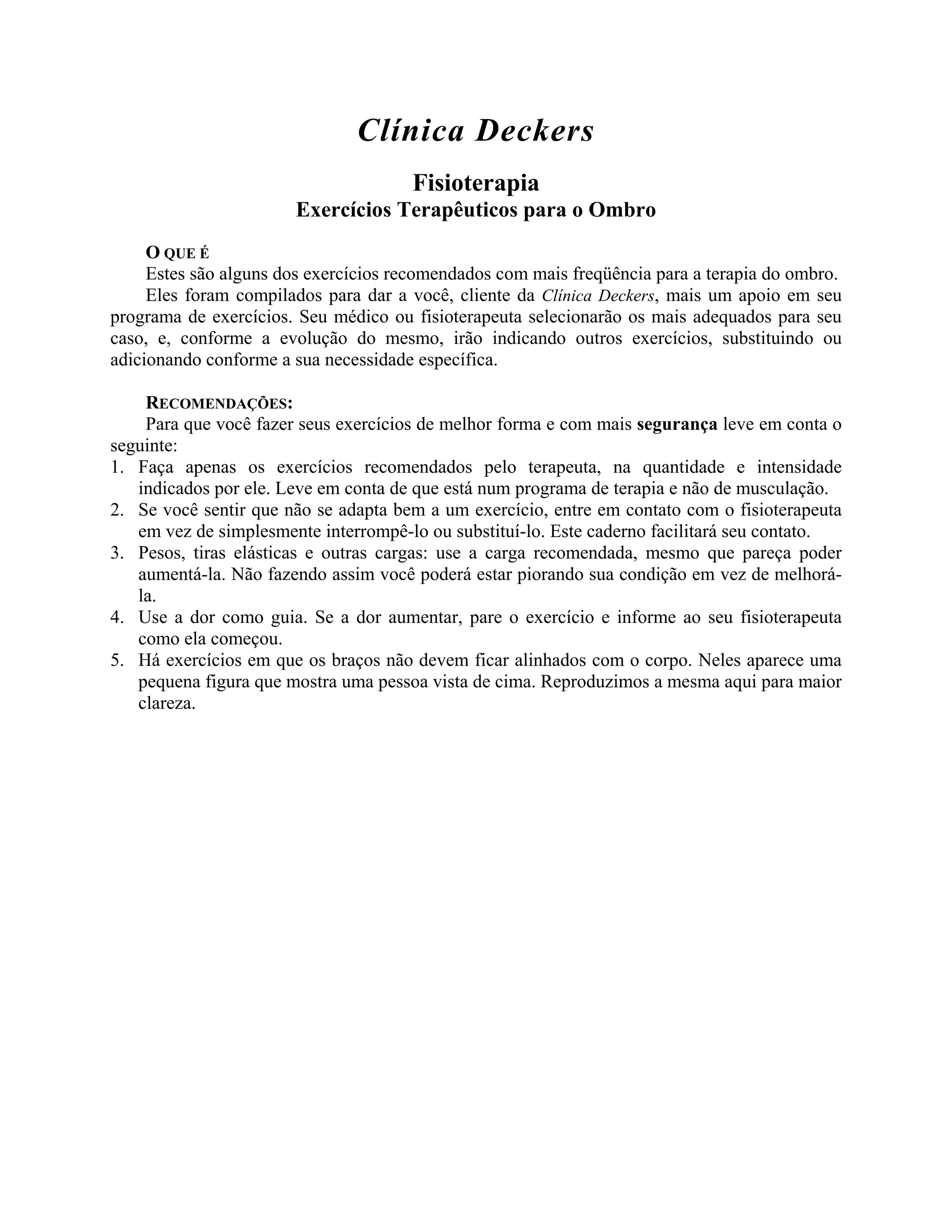 Este documento fornece 33 exercícios terapêuticos recomendados para o ombro, com instruções detalhadas para cada um. É importante seguir as recomendações do médico ou fisioterapeuta para a seleção, intensidade e frequência adequada dos exercícios de acordo com cada caso.