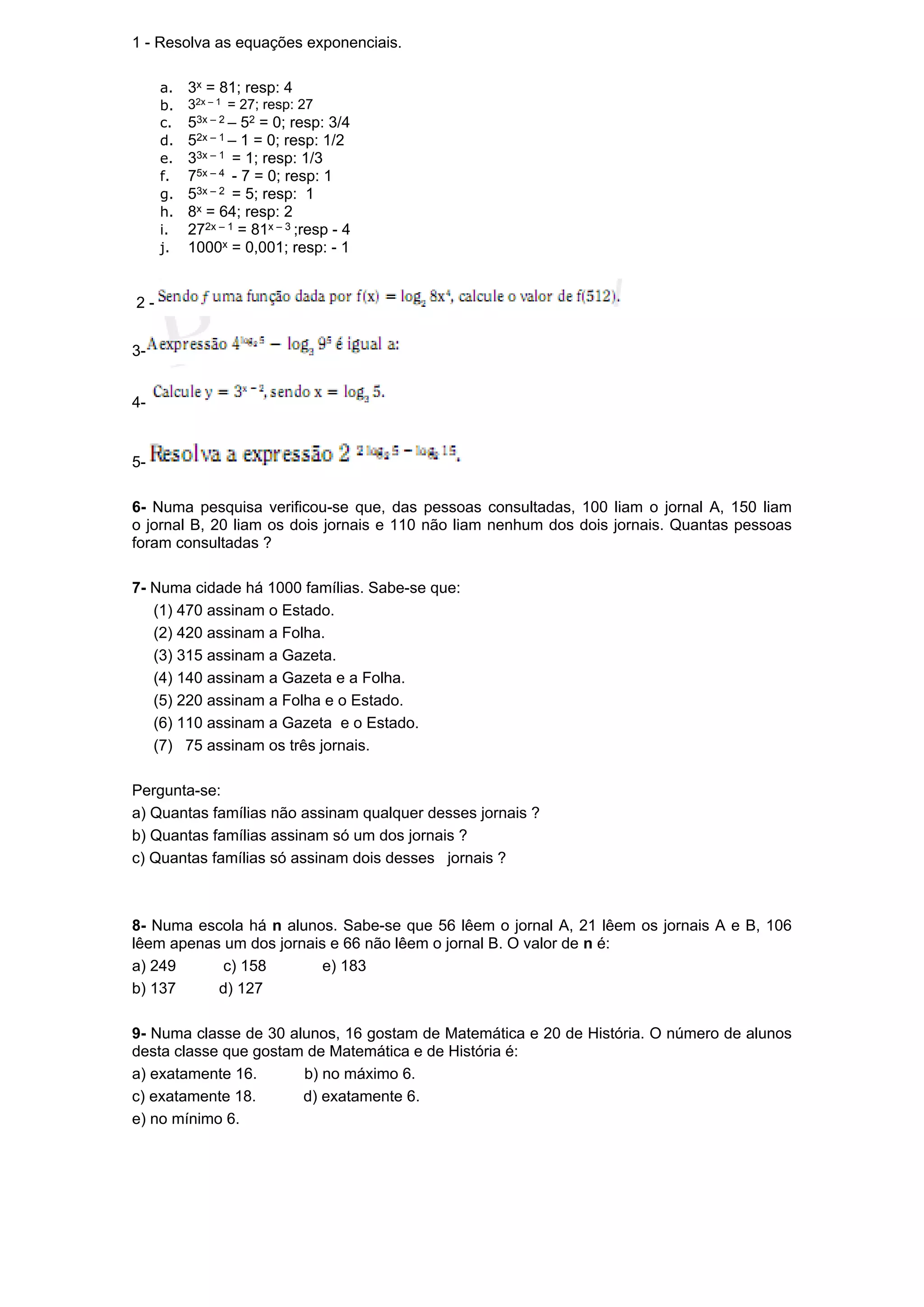 2. As questões 1-10 envolvem resolução de equações exponenciais, operações com conjuntos e probabilidade.