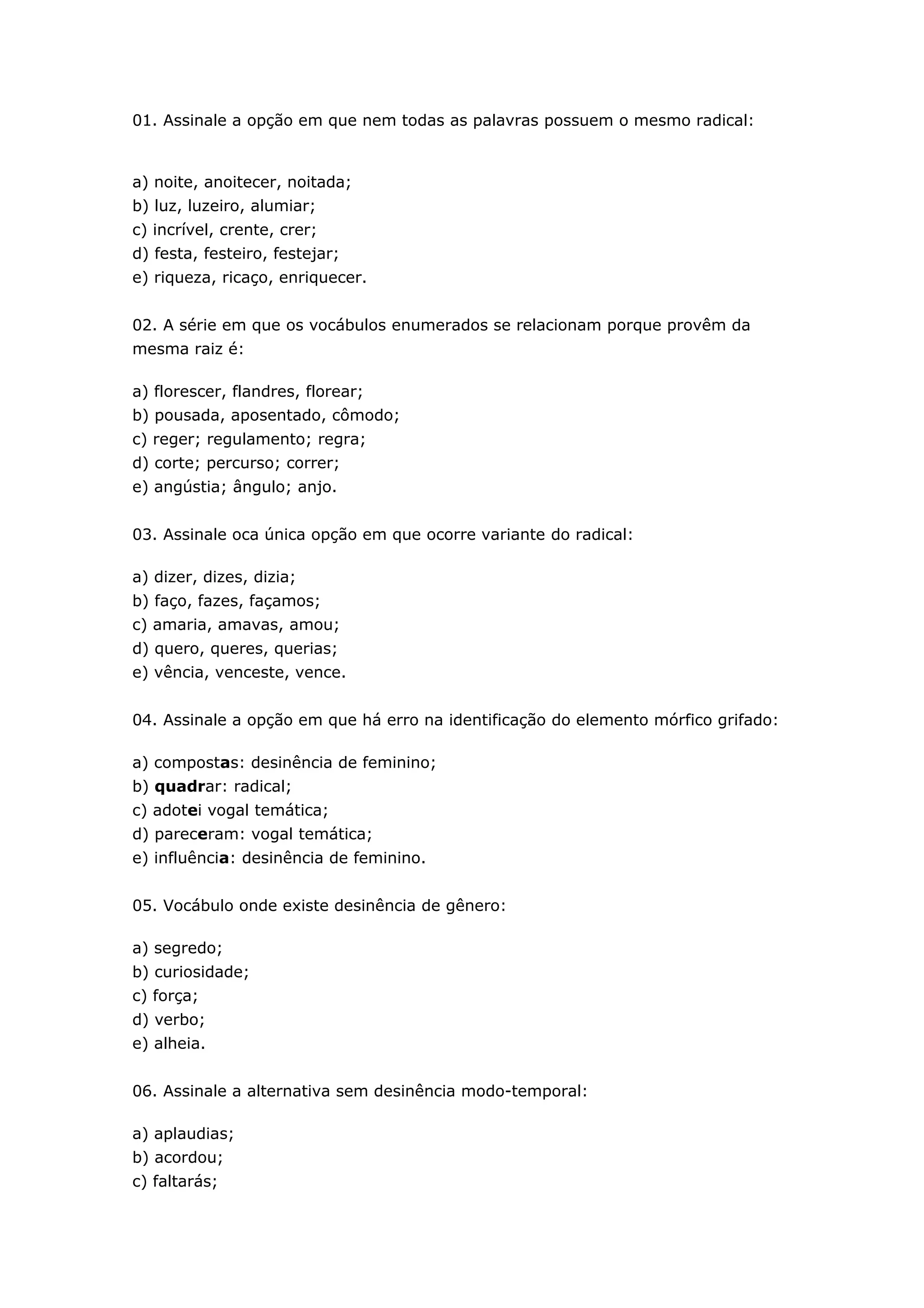 1. O documento contém 14 questões sobre morfologia e formação de palavras em português. As questões abordam tópicos como radicais, desinências, processos morfológicos como derivação e composição.