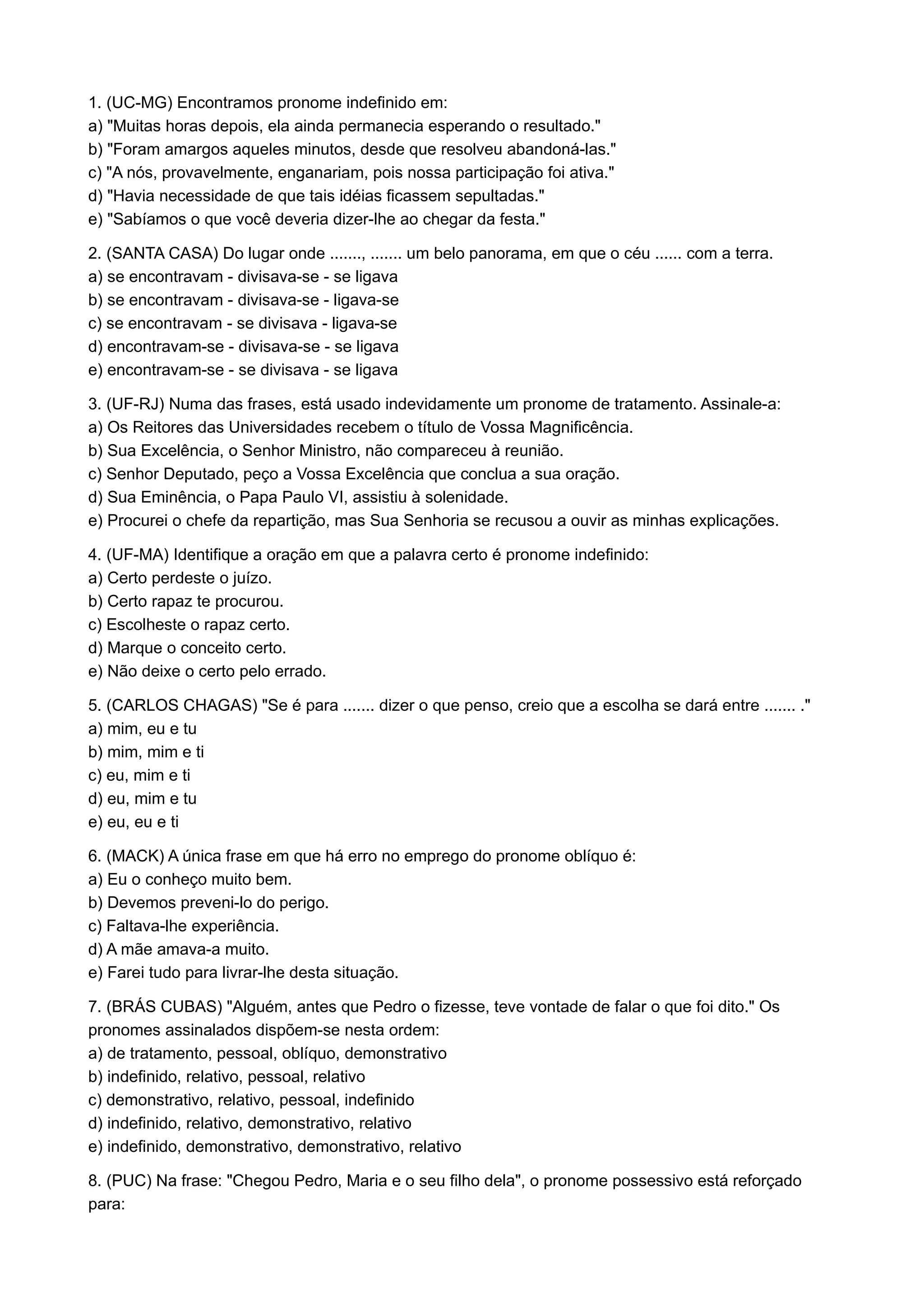 1) O documento apresenta 14 questões sobre pronomes indefinidos, pessoais, oblíquos e possessivos em português.