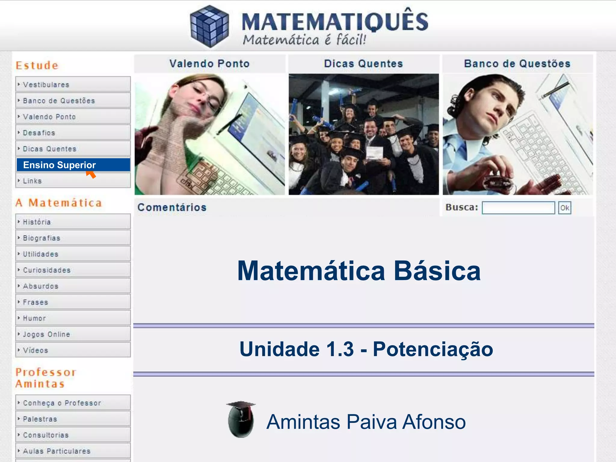 O documento discute as propriedades de potenciação, definindo potência como uma expressão contendo uma base e um expoente. As propriedades incluem potências de expoente zero e um, multiplicação e divisão de potências com a mesma ou diferentes bases, potência de uma potência, e potências com expoentes negativos.