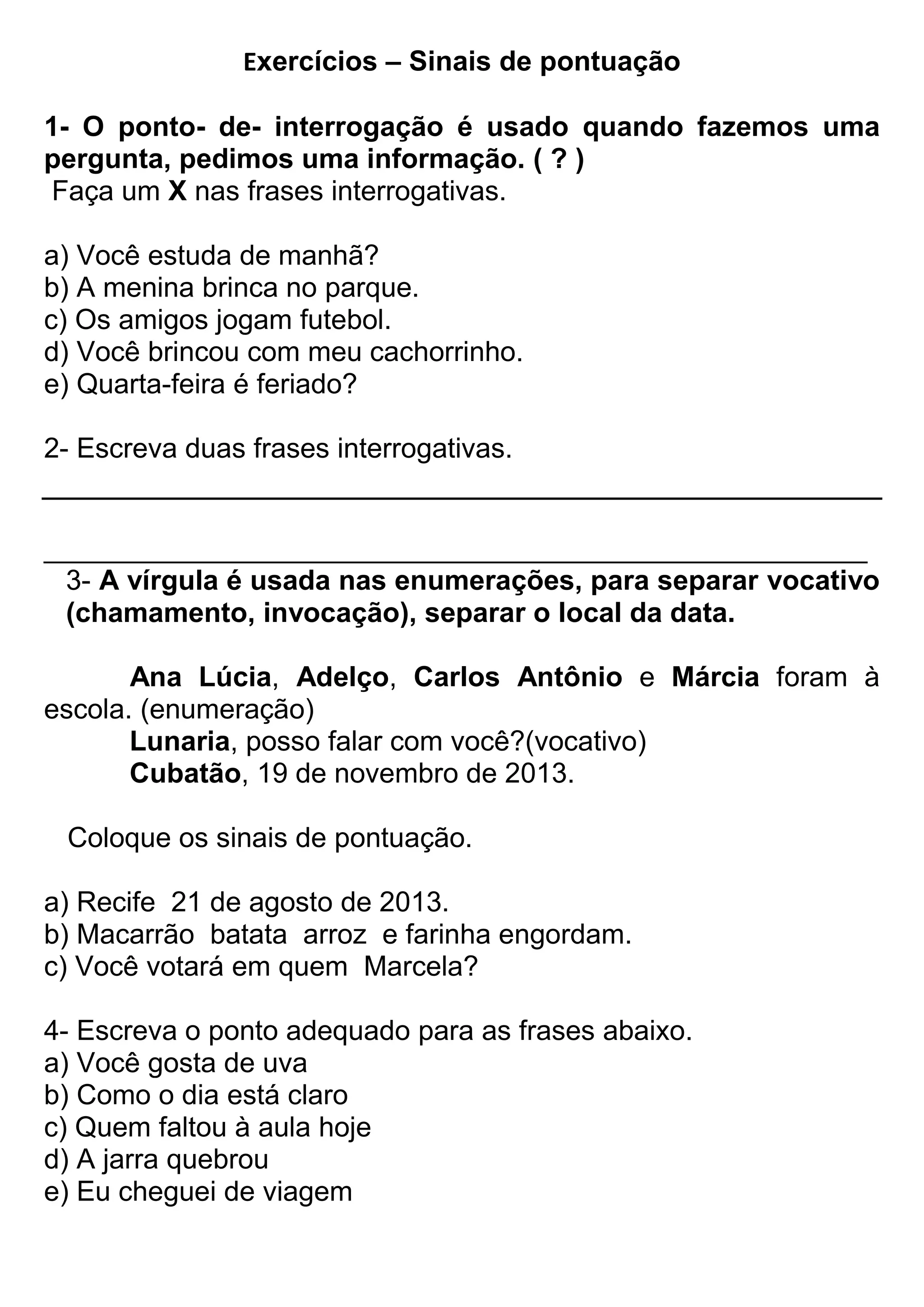O documento descreve os principais sinais de pontuação em português - ponto de interrogação, vírgula e ponto de exclamação - e fornece exemplos de seu uso correto. Exercícios pedem para identificar frases interrogativas, enumerações e vocativos, e usar os sinais de pontuação apropriadamente. O ponto final é usado para finalizar frases declarativas, enquanto o ponto de exclamação expressa emoções.