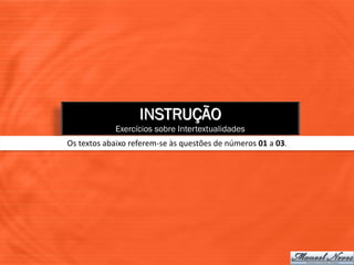 O documento discute intertextualidade entre dois textos literários. O primeiro texto descreve moças indígenas e é de autoria de Pero Vaz de Caminha. O segundo texto é um poema de Oswald de Andrade que copia quase literalmente a descrição de Caminha, com poucas alterações. O poema de Andrade usa a apropriação do texto original para fins paródicos e de crítica cultural.